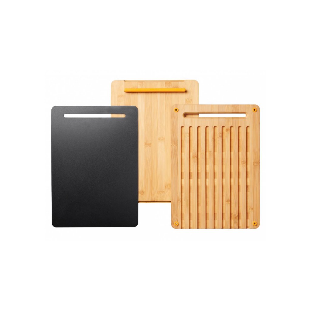 Fiskars Functional Form™ Bambusz vágódeszka szett tartalmazza kenyér és tészta vágódeszkát barázdákkal a morzsák felfogására és lapos vágódeszkát kivehető műanyag tányérral.