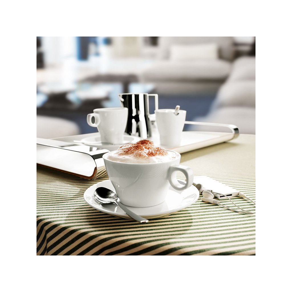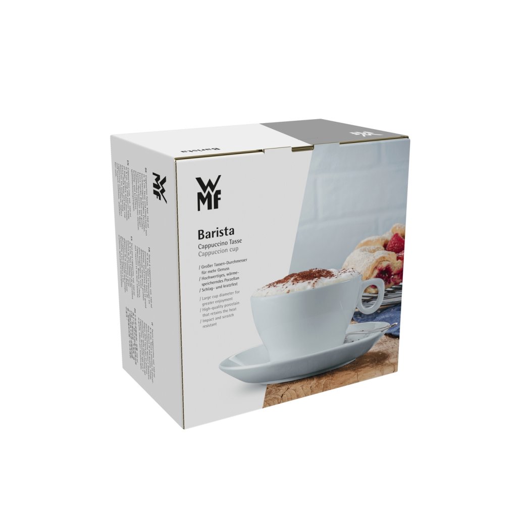 Az összetéveszthetetlen dizájnnal rendelkező Barista capuccino csésze és kistányér stabilitását az ezüst WMF logóval, látványos domborulattal ellátott kistányér és az annak megfelelő mélyedés biztosítja.