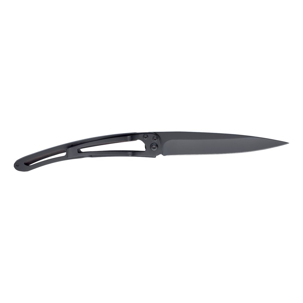 Ez az ultrakönnyű zsebkés kiváló minőségű nemesacélból készül. A „liner lock” típusú zárnak köszönhetően használata biztonságos és egyszerű. A késnek fekete titánfelülete van, markolata exotikus granadillafából készül, amely a legsűrűbb, legnehezebb és legnedvességtűrőbb fák közé tartozik a világon. A granadillának, avagy a „blackwood” fának gyönyörű, ébenfekete színe van. A kés nyelén egy praktikus klipsz is található, ennek köszönhetően akár a nadrágszíjra, vagy a nadrágzsebre csíptetve is hordható, de akár bankjegyek is kapcsolhatók hozzá.