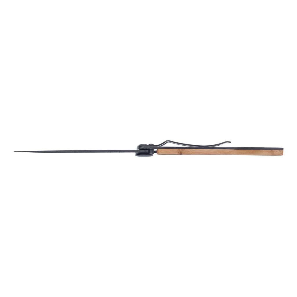 Ez az ultrakönnyű zsebkés kiváló minőségű nemesacélból készül. A „liner lock” típusú zárnak köszönhetően használata biztonságos és egyszerű. A késnek fekete titánfelülete van, markolata francia borókafából készül, amely egy karimzatikusan illatozó, kifejezetten szilárd fa. Illata lágy és borsos beütésű. A kés nyelén egy praktikus klipsz is található, ennek köszönhetően akár a nadrágszíjra, vagy a nadrágzsebre csíptetve is hordható, de akár bankjegyek is kapcsolhatók hozzá.