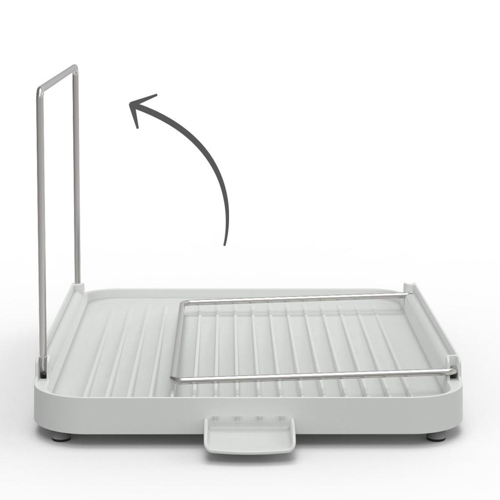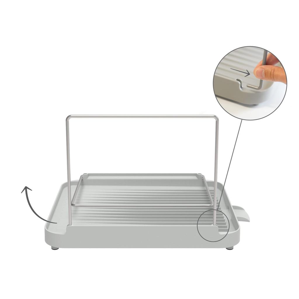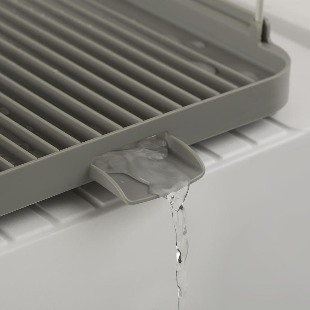 - A beépített kifolyócső elvezeti a felfogott vizet közvetlenül a mosogatóba, és segít szárazon tartani a munkalapot még nagy mennyiségű edény esetén is.