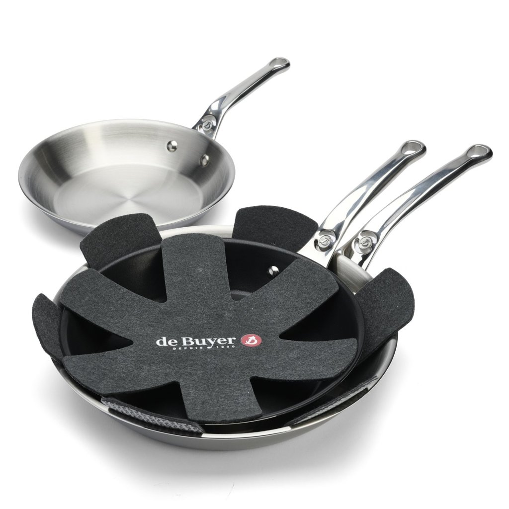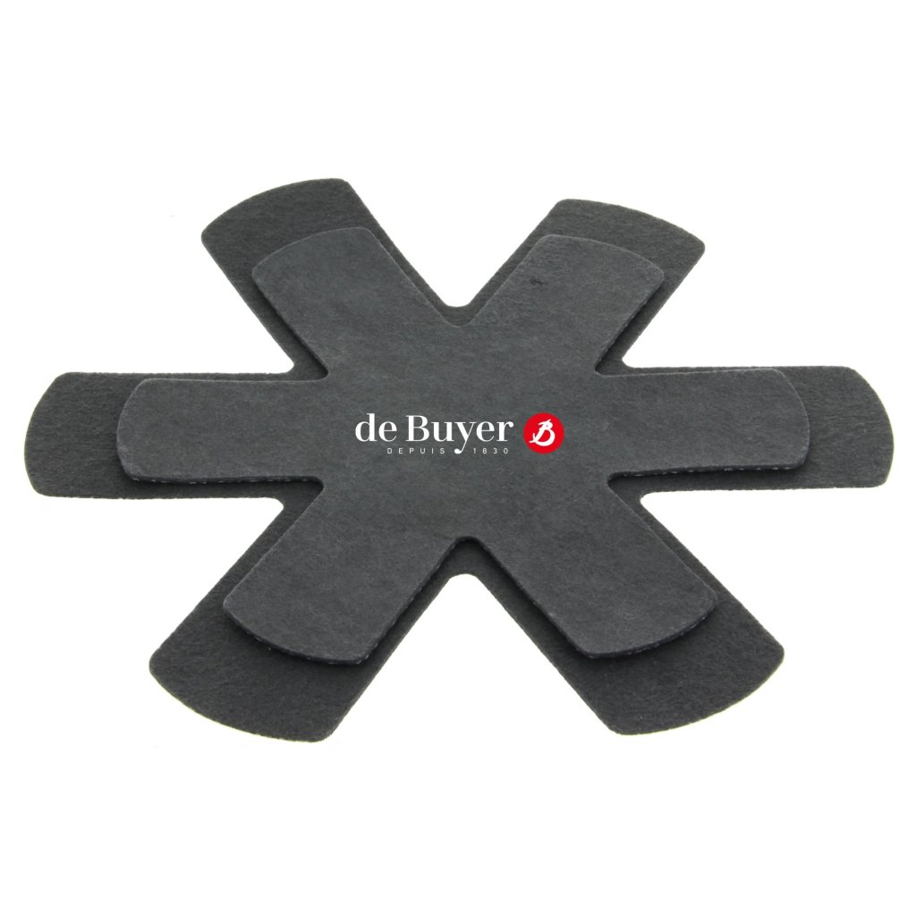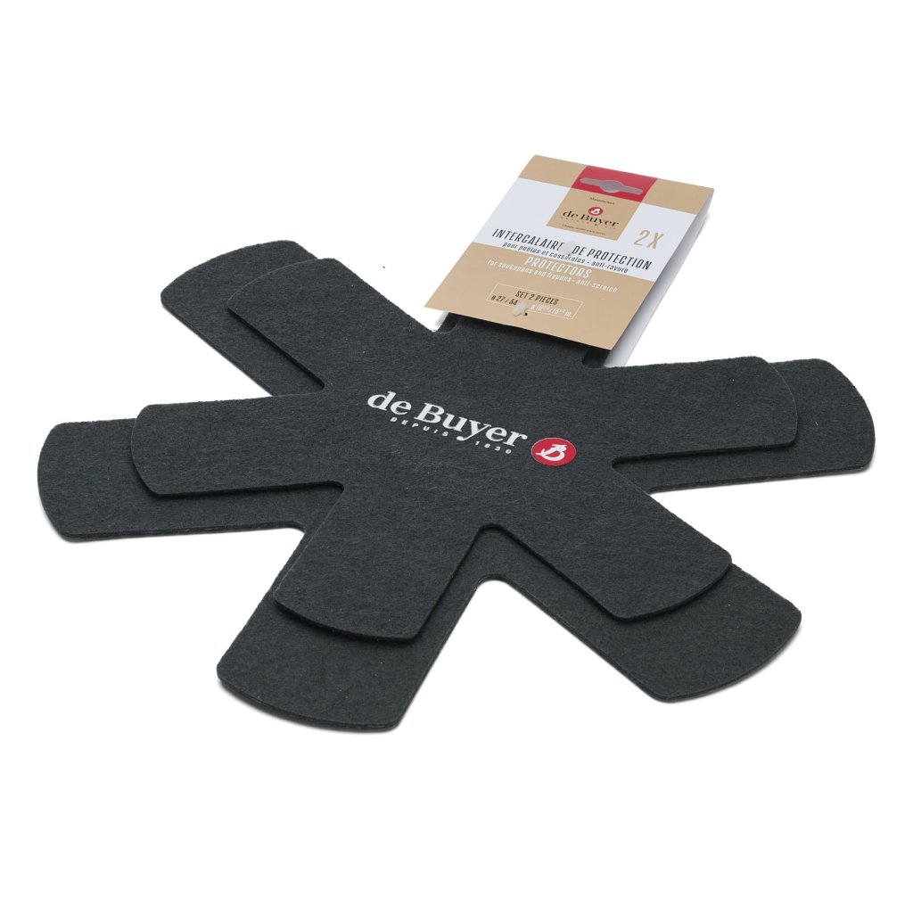 - A két darabos védőbetét de Buyer készlet serpenyők és edények biztonságos tárolására szolgál, a felület megkarcolódásának kockázata nélkül.