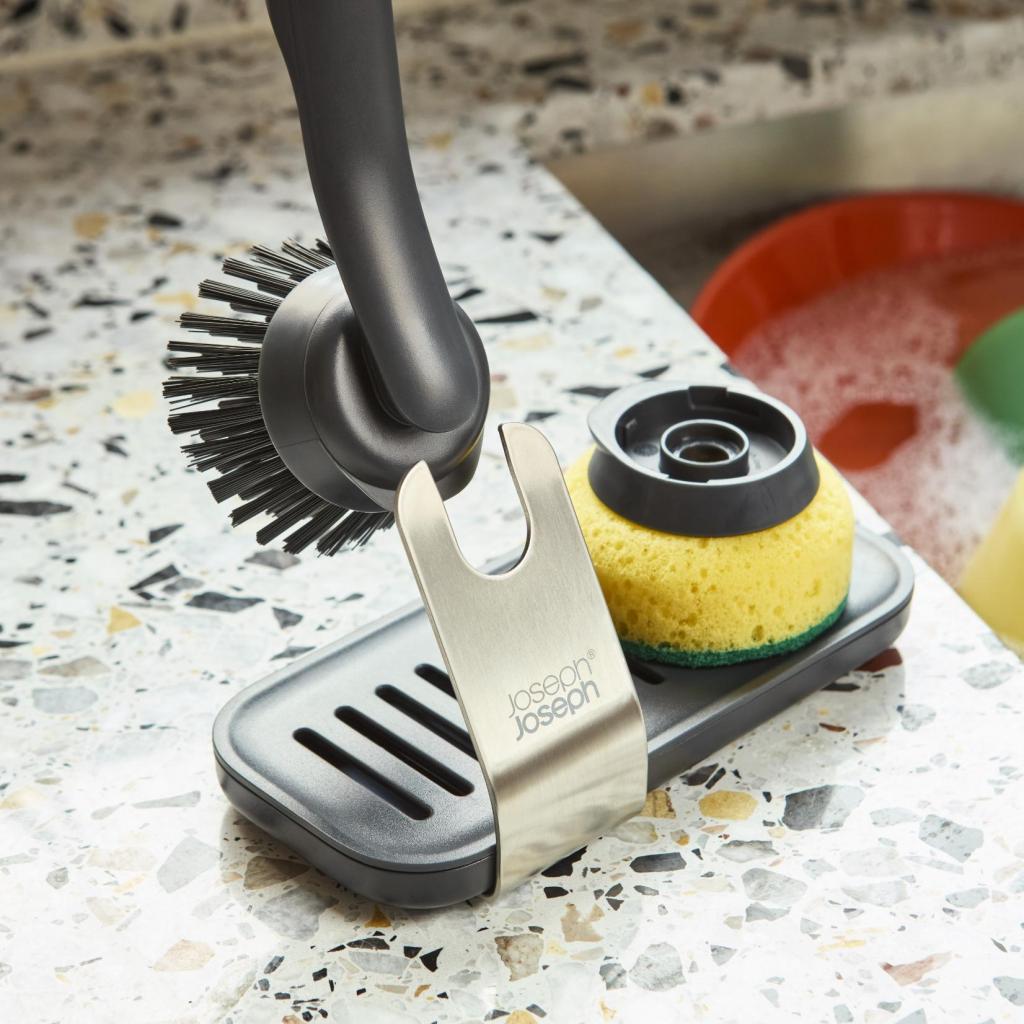 - A SINKTECH tartóval ellátott szürke színű kefés és szivacsos készlet átfogó megoldást kínál az edények hatékony mosogatásához, valamint a mosogató körüli tér tökéletes rendben tartásához.