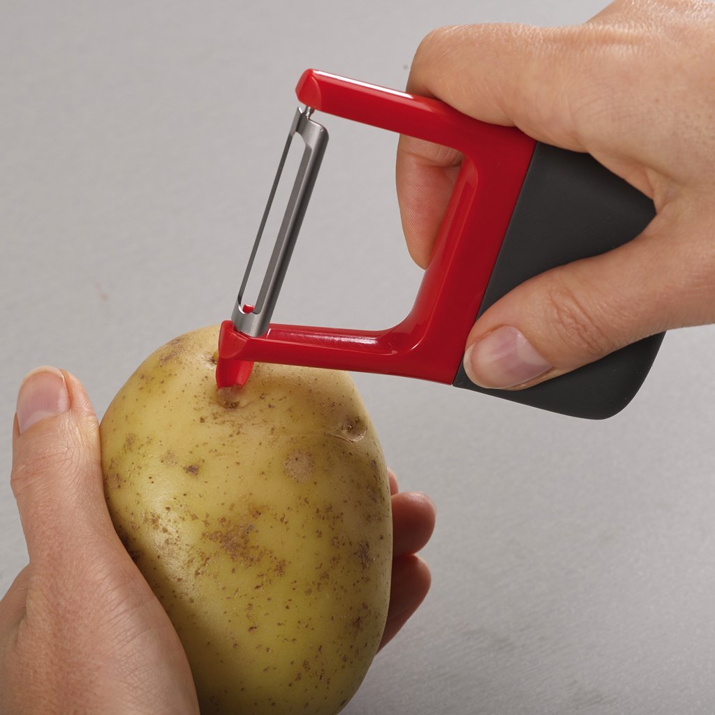 A Duo a Joseph Joseph innovatív konyhai termékcsaládja, amely ötletes megoldásokat kínál minden konyhába. A termékcsalád gondosan megtervezett, az egyszerűségre, az innovációra, a funkcionalitásra és a minőségre helyezve a hangsúlyt. A termékcsalád minden egyes terméke kiváló minőségű anyagokból készül, és széles színválasztékban kapható, hogy illeszkedjen a dekorációhoz vagy más konyhai kiegészítőkhöz és eszközökhöz. Például ez az egyenes hámozó a termékcsalád része. Kiváló minőségű rozsdamentes acél penge, ergonomikus fogantyú, krumplifolt eltávolító.