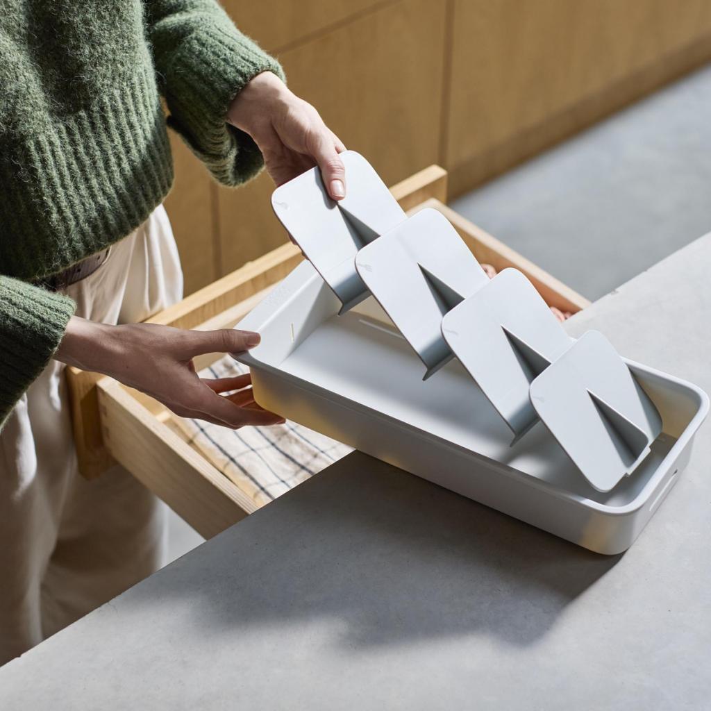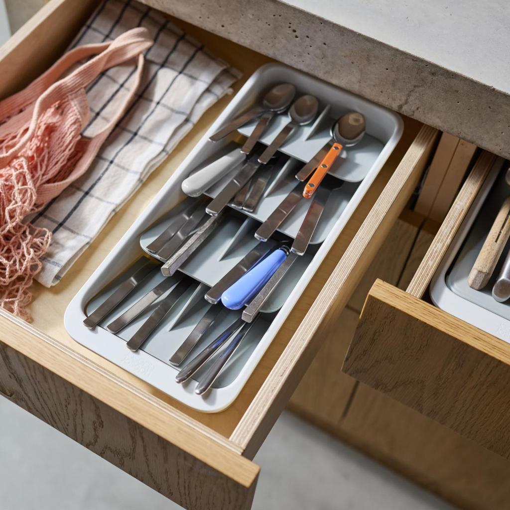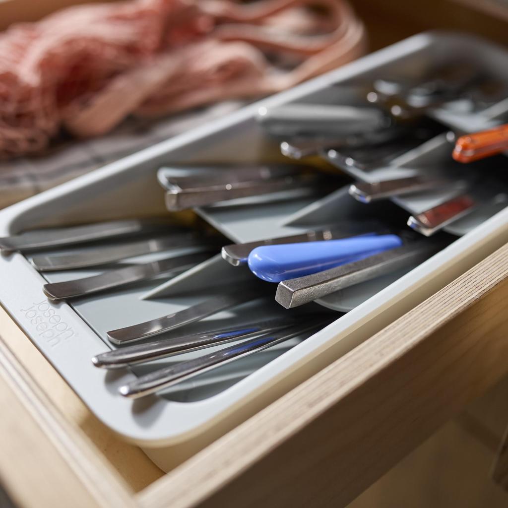 - A Joseph Joseph DRAWERSTORE kompakt evőeszköz-szervező segít az evőeszközök áttekinthető elrendezésében még a kisebb konyhai fiókokban is.