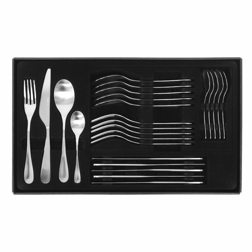 - evőeszközkészlet 6 főre, 24 darabot tartalmaz: 6 villát, 6 kést, 6 kanálat és 6 teáskanálnyit, ideális mindennapi használatra és ünnepi alkalmakra.