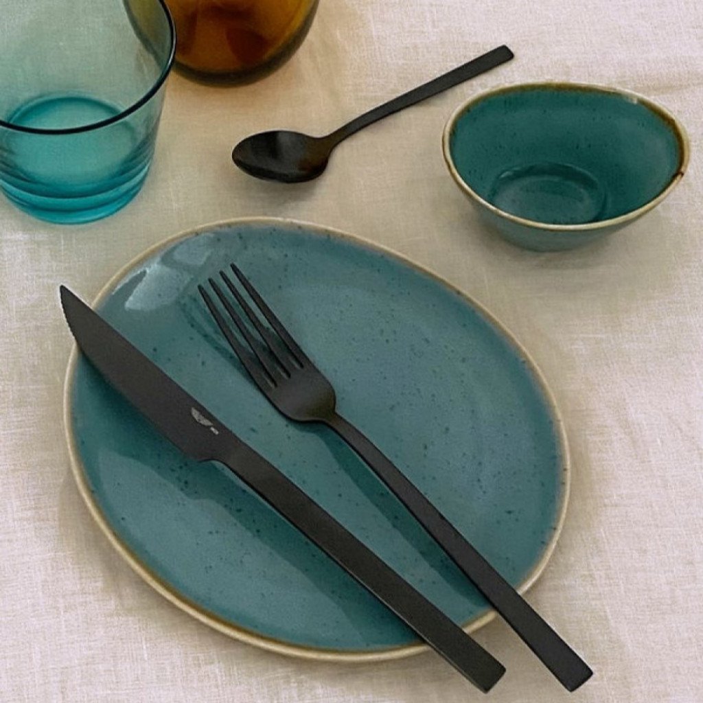 - az evőeszközök matt antracit árnyalata jellegzetes dizájnelemet alkot, és minden asztali terítéknek jellegzetes karaktert kölcsönöz