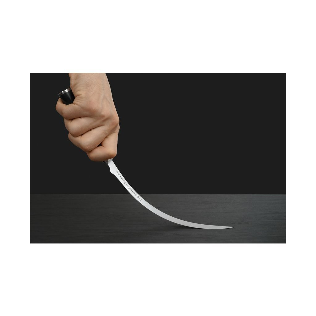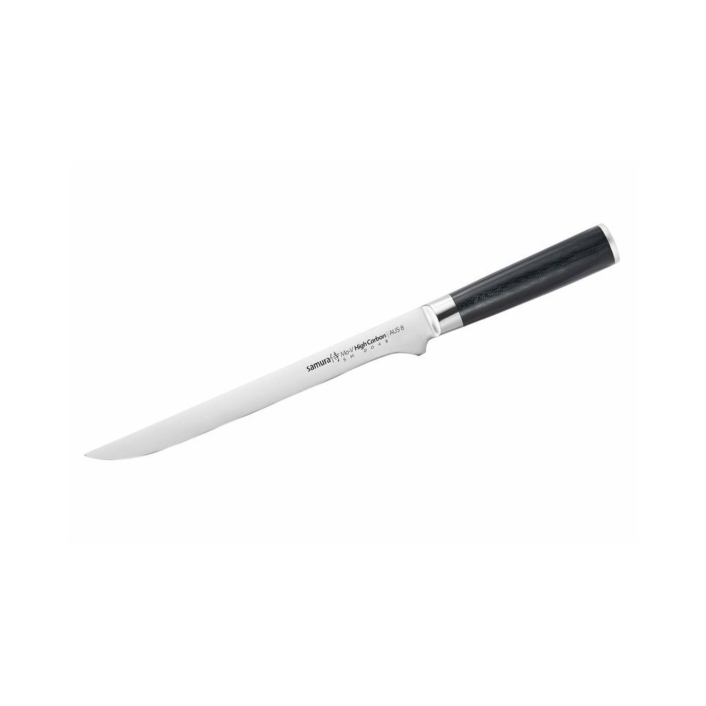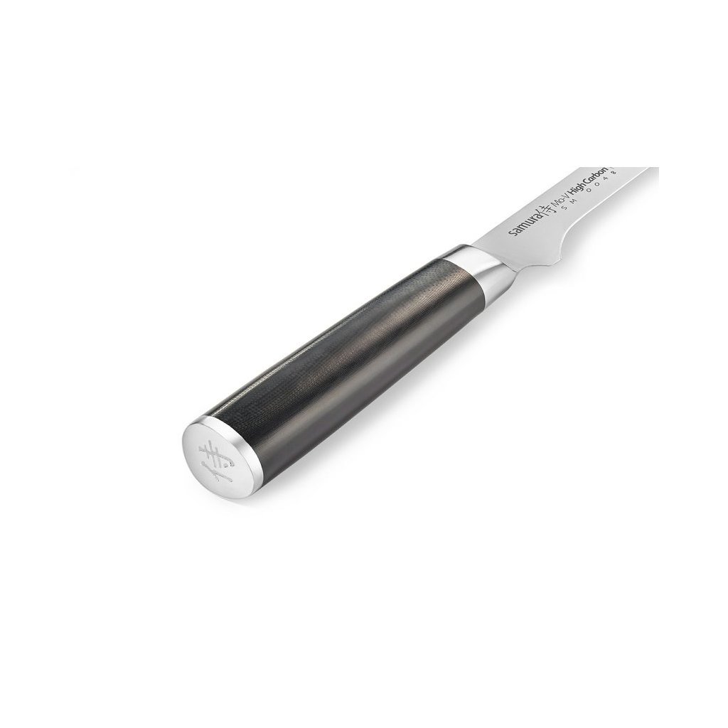 Ez a professzionális Samura filézőkés elengedhetetlen a hús és hal feldolgozásához, vágásához és kicsontozásához. Ugyanakkor más tevékenységekre is alkalmas, például bármilyen élelmiszer szeletelésére. A 21,8 cm hosszúságú és 59 HRC keménységű penge nagyon tartós és nagy terhelésnek is ellenáll.