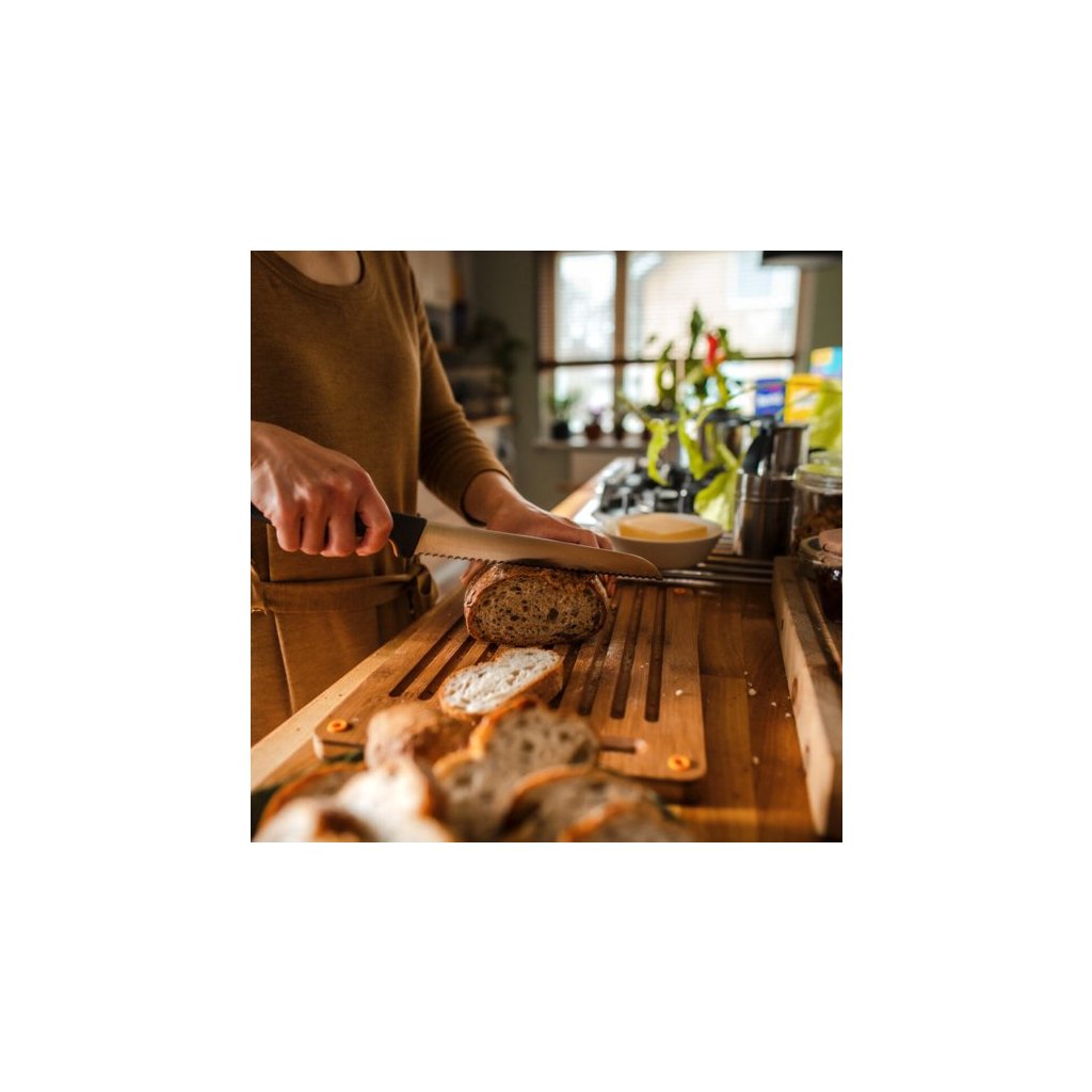 A FISKARS Functional Form kenyérvágó kés nélkülözhetetlen a mindennapi használathoz. Hosszú, robusztus pengéje japán rozsdamentes acélból készült, fogazással ellátott. Ideális kenyér és más kemény héjú pékáruk szeletelésére.
