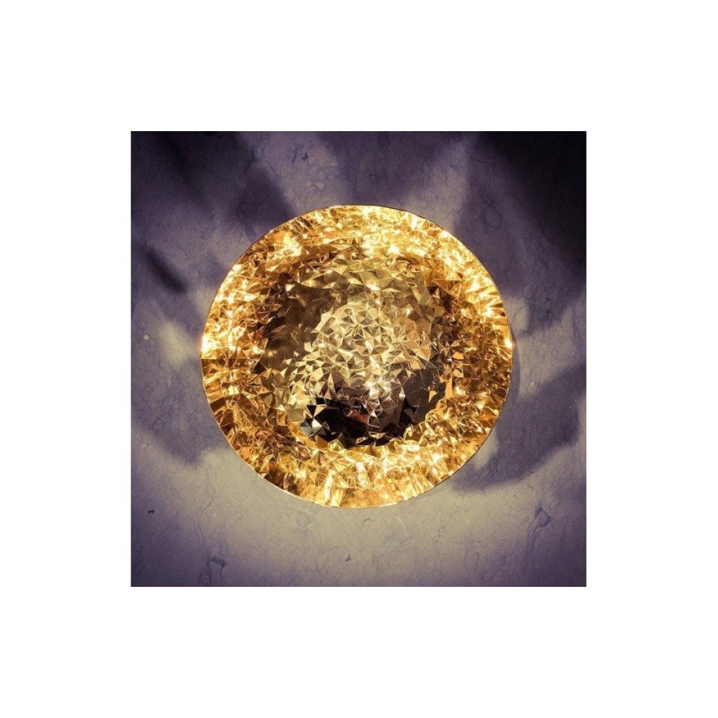 Joy No.11 gyümölcstál, Claudia Raimondo tervezte, új technológiával készült - rozsdamentes acél hidegfeldolgozással. A tál formája a fényvisszaverődésekjátékát hozza létre, ahogyan azt a múltból ismerjük a nemesfémből készült kovácsolt tárgyak esetében. A textúra tehát felidézi a digitális világ hátterét, és a designmegfoghatatlanságával játszvaújraértelmezi az acélt. Ez a tál kézzel aranyozott 24 karátos arannyal.