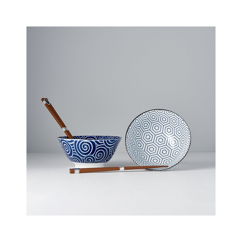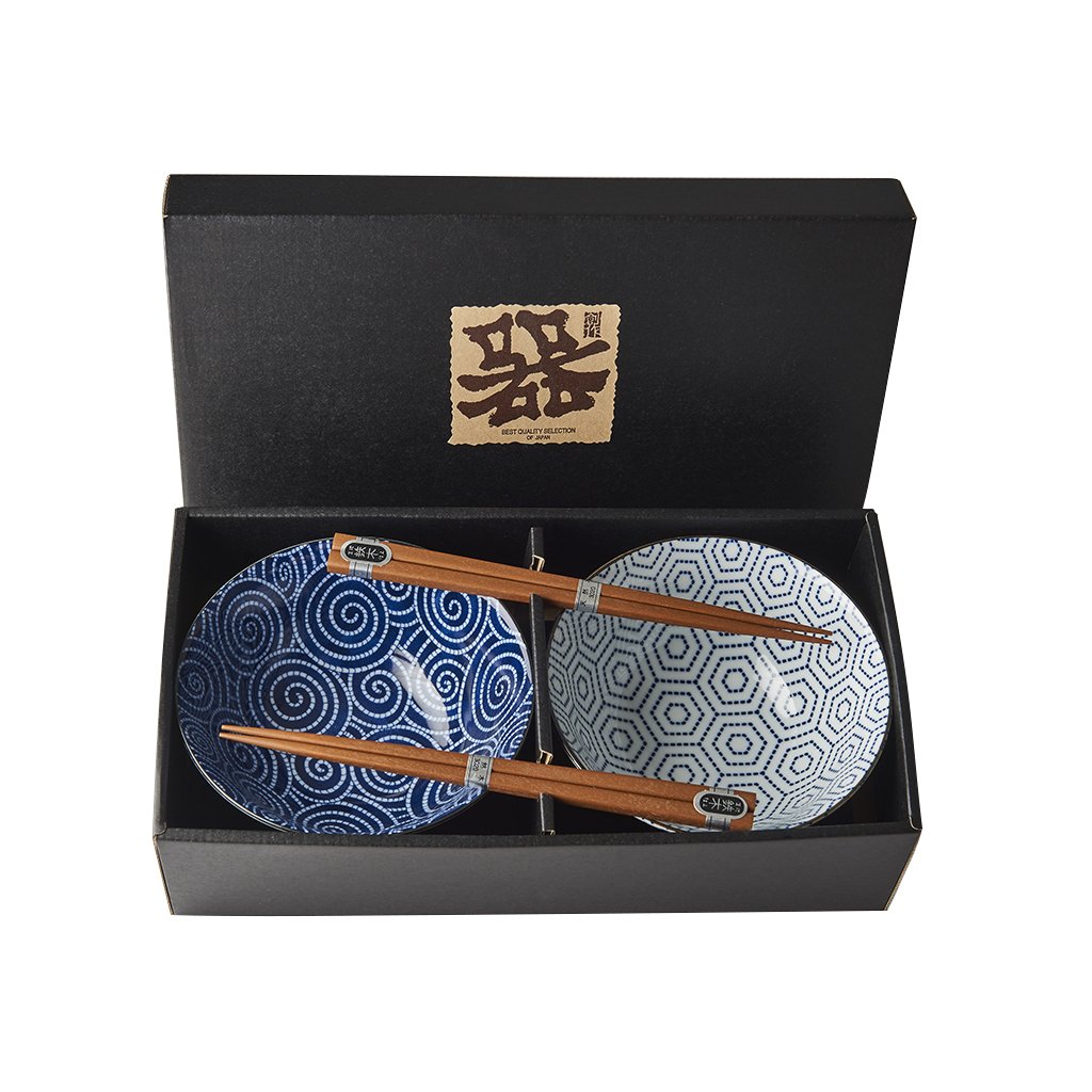 A késztlet tartalma 2 db fából késztült pálcika és 2 tál geometrikus fehér és kék mintákkal. A tálak pereme arany színnel van megfestve. Ez a késztlet elegáns fekete dobozban van, így akár ajandéknak is alkalmas.