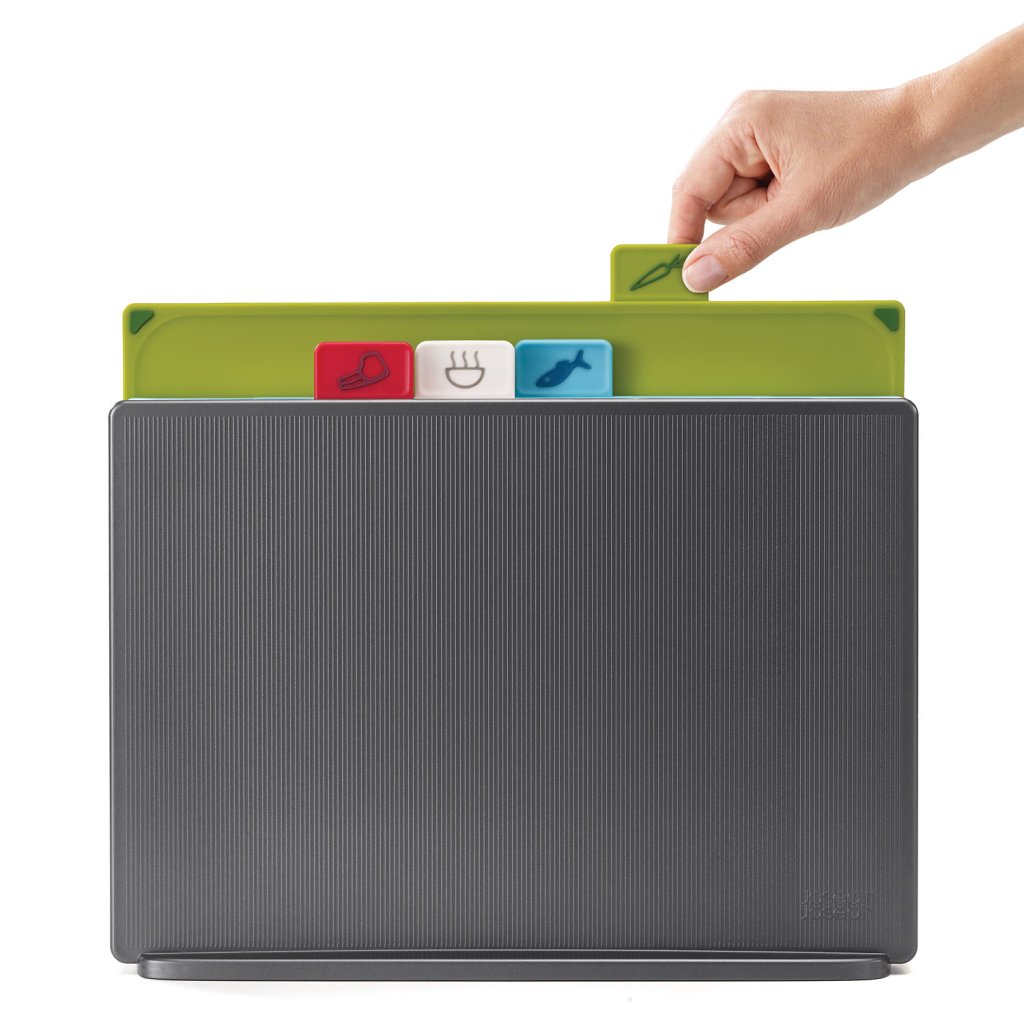 A műanyag vágódeszkák nagy előnye, hogy könnyen karbantarthatók, higiénikusak és (főleg) nem tompítják feleslegesen a késeinket. A dizájnerek feladata ezúttal az volt, hogy olyan alkalmatosságot tervezzenek, amelynek köszönhetően a vágódeszkáinkat a kezünk ügyében, a munkapulton tarthatjuk, 100 %-ban teljesítik küldetésüket és ráadásul a tárolásuk is elegánsan és praktikusan megoldott. A legesleggyakoribb konyhai munkálatot hivatott forradalmasítani az Index vágódeszka és állvány, amely mappaszerűen tárolja a vágódeszkáinkat, szinte irodai pedantériával és eleganciával. Hihetetlenül praktikus újítás az is, hogy az egyes vágódeszkák nemcsak funkciójukhoz alakított színben pompáznak, de struktúrájuk is ehhez a funkcióhoz kapcsolódik. Az egyes vágódeszkákat grafikus jelzéssel is ellátták a könnyebb megkülönböztethetőség kedvéért.