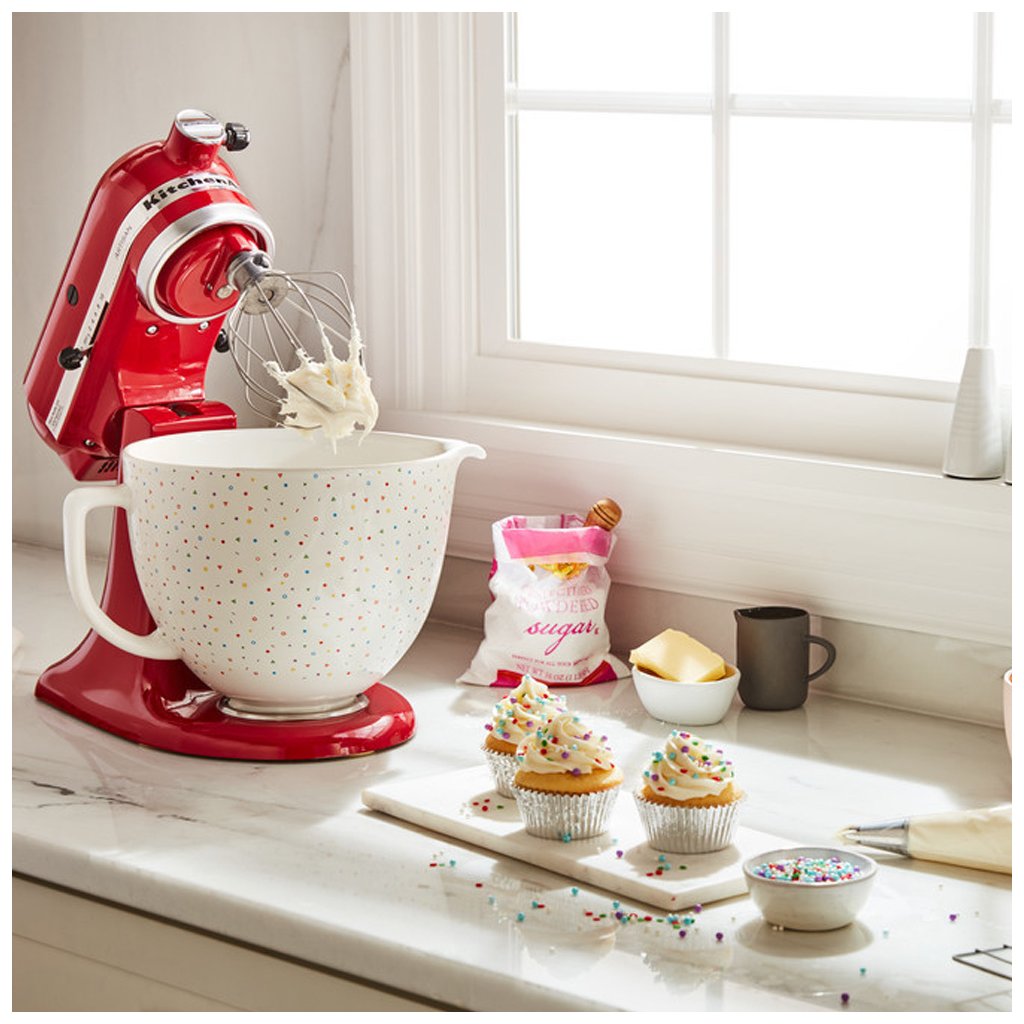 Ha Ön boldog tulajdonosa egy KitchenAid Artisan konyhai robotgépnek, akkor érdemes megvásárolnia ezt a konfetti mintás kerámia tálat is, amely még magasabb szintre emeli a robotgép kivételes funkcióit. Ez a gyönyörű kerámia tál bírja a magas és az alacsony hőmérsékletet is. Mikrohullámú sütőben, fagyasztóban és sütőben is használható, valamint mosogatógépben mosható. Könnyen használható, mivel kiöntővel és kényelmes fogantyúval rendelkezik. Exkluzív megjelenése bármilyen konyhában szépen mutat.