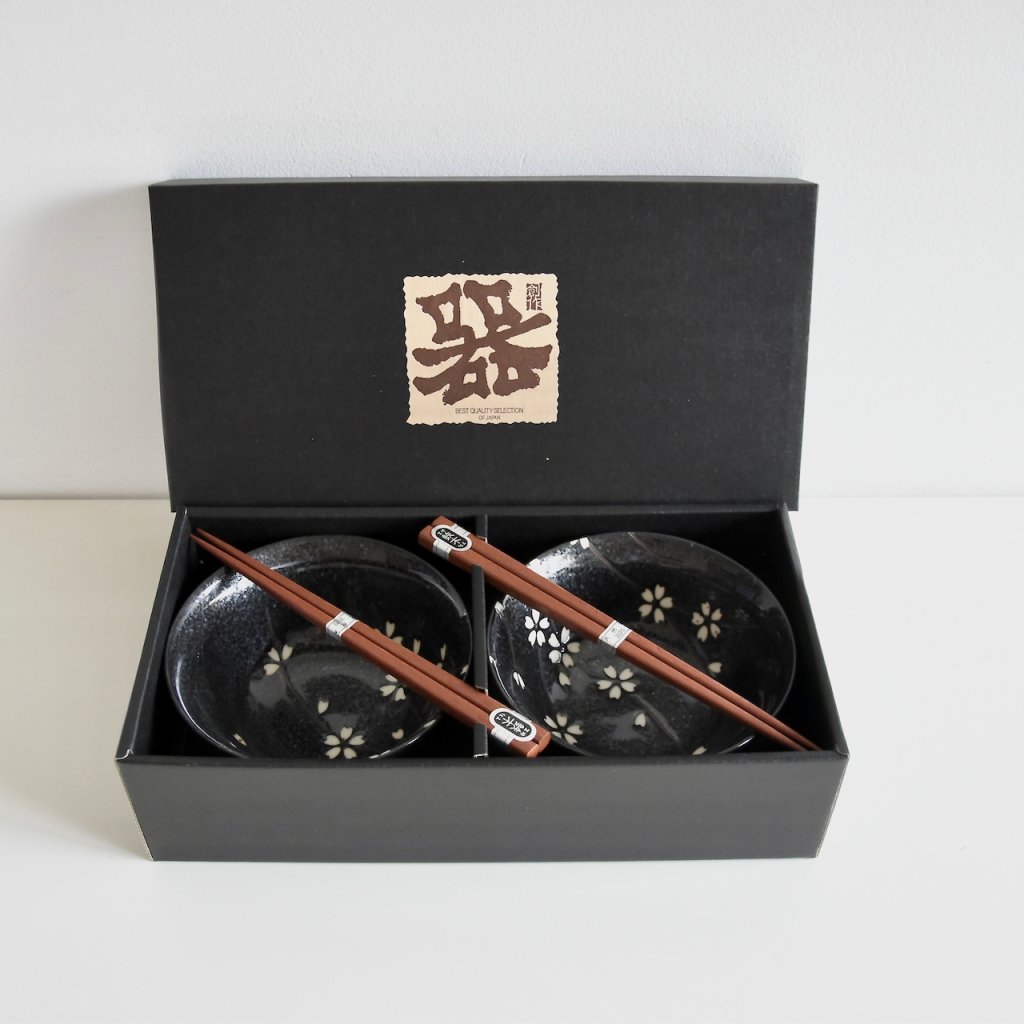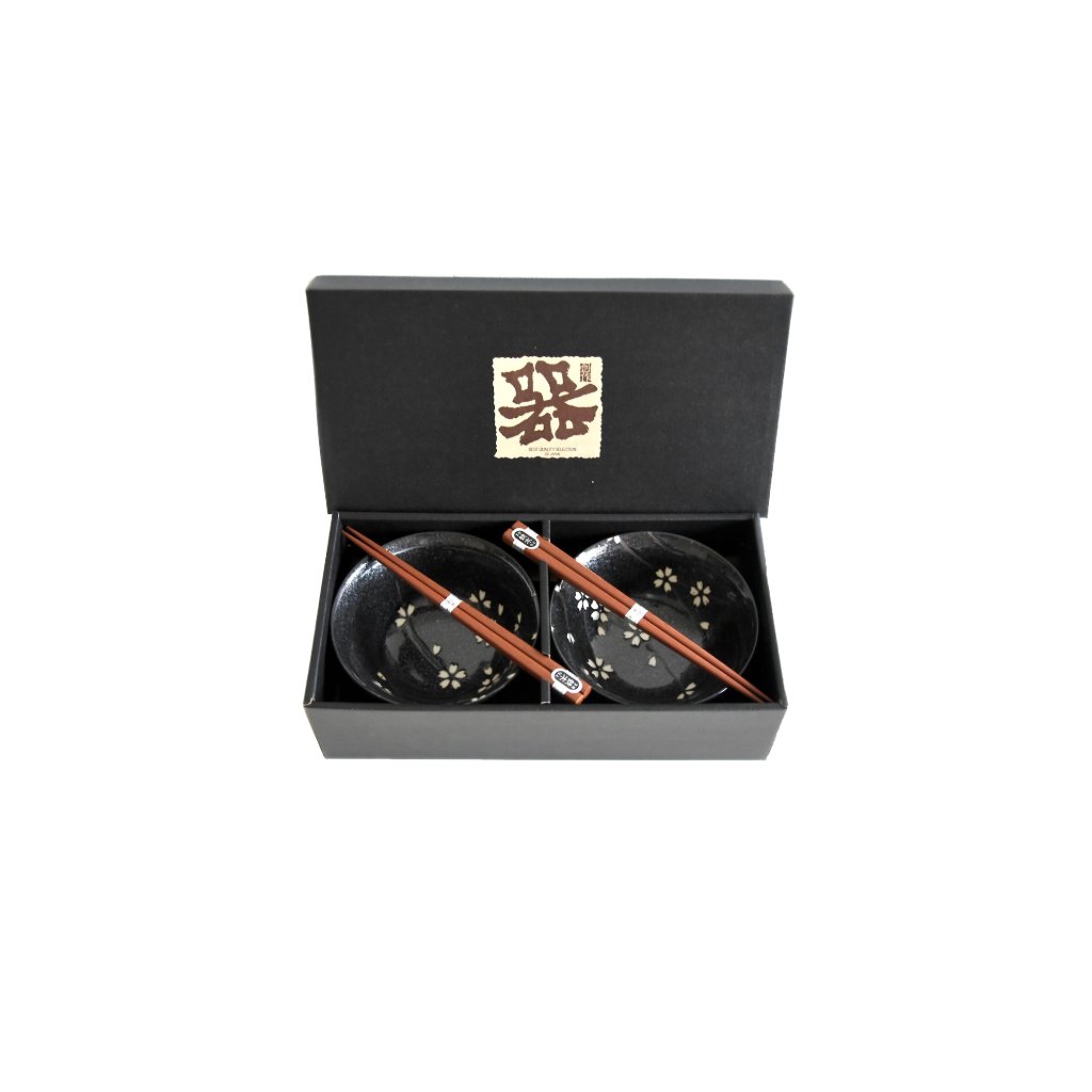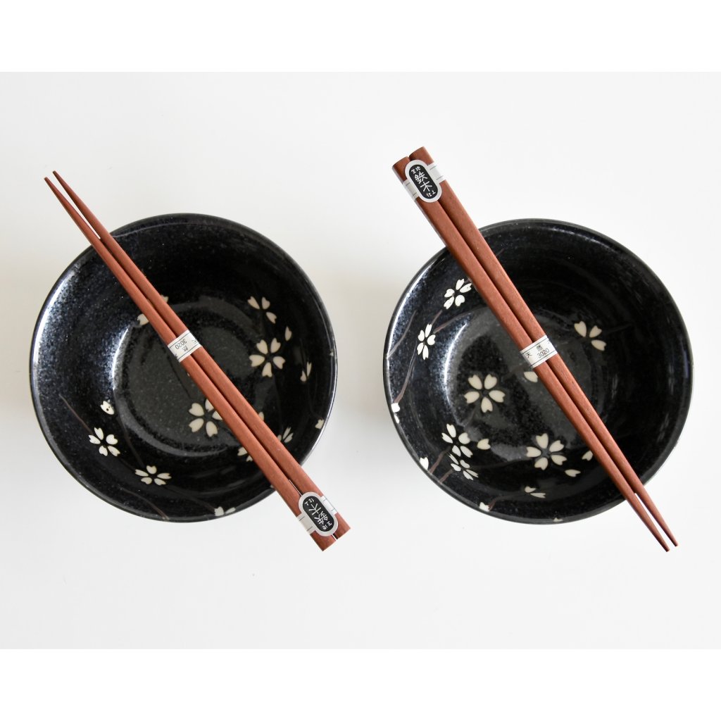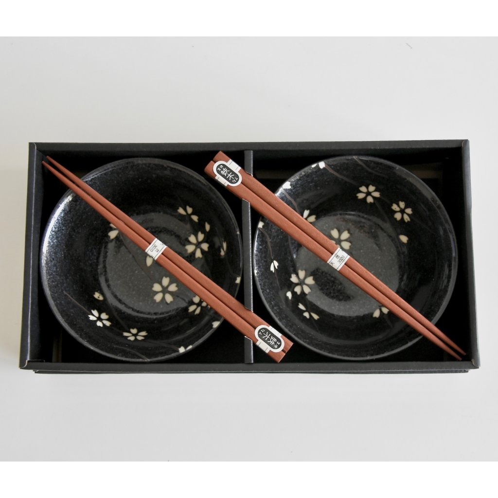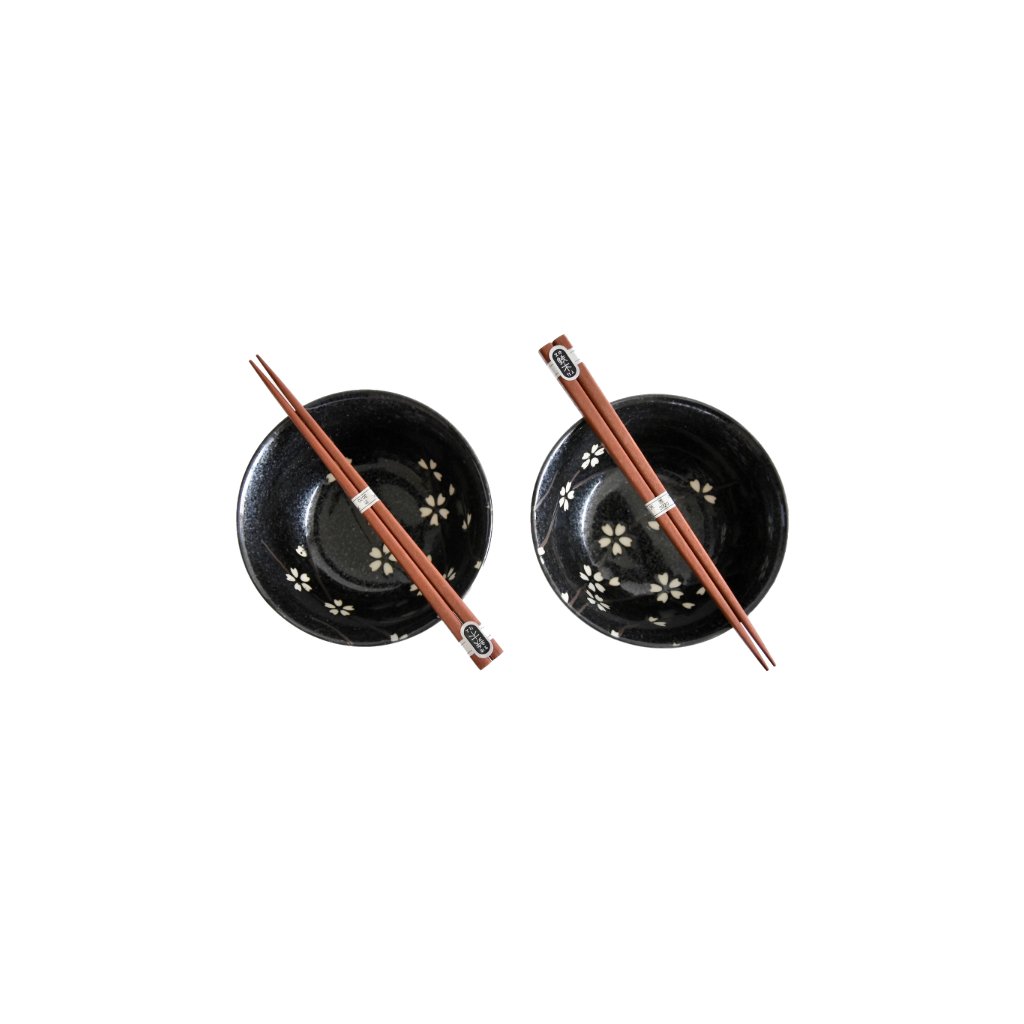 Étkező tálkák 2 db szett, 400 ml, evőpálcikákkal, fekete fehér virágokkal, MIJ