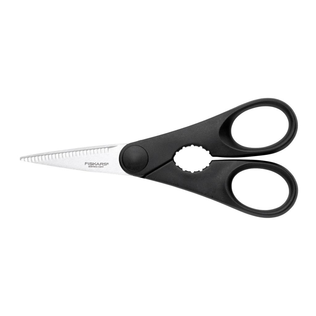 Az Fiskars Essential sorozatú konyhai olló erős, éles, fogazott pengékkela könnyű vágásért, és kontúros markolattal a PET palackokkinyitásához.