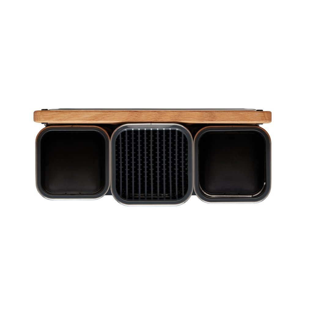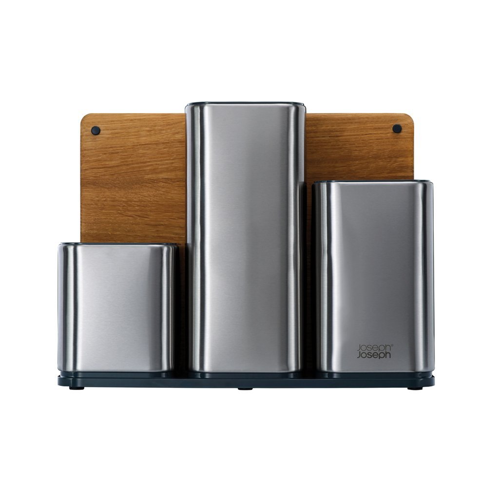Rozsdamentes acélból készült kompakt szervező JOSEPH JOSEPH CounterStore 100 a konyhai munkalapra. Helyet biztosít a kések, valamint kisebb és nagyobb konyhai eszközök tárolására. Az állvány hátulján lévő tartóban elhelyezett fából készült vágódeszkával van felszerelve. A kések műanyag nyílásokba csúsznak, amelyek a pengéket elkülönítve és biztonságban tartják, a karcolódás veszélye nélkül. A késpenge maximális hossza 20 cm.