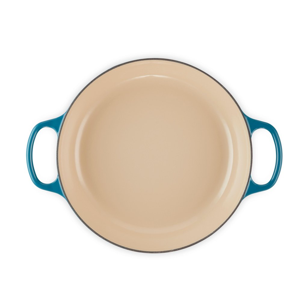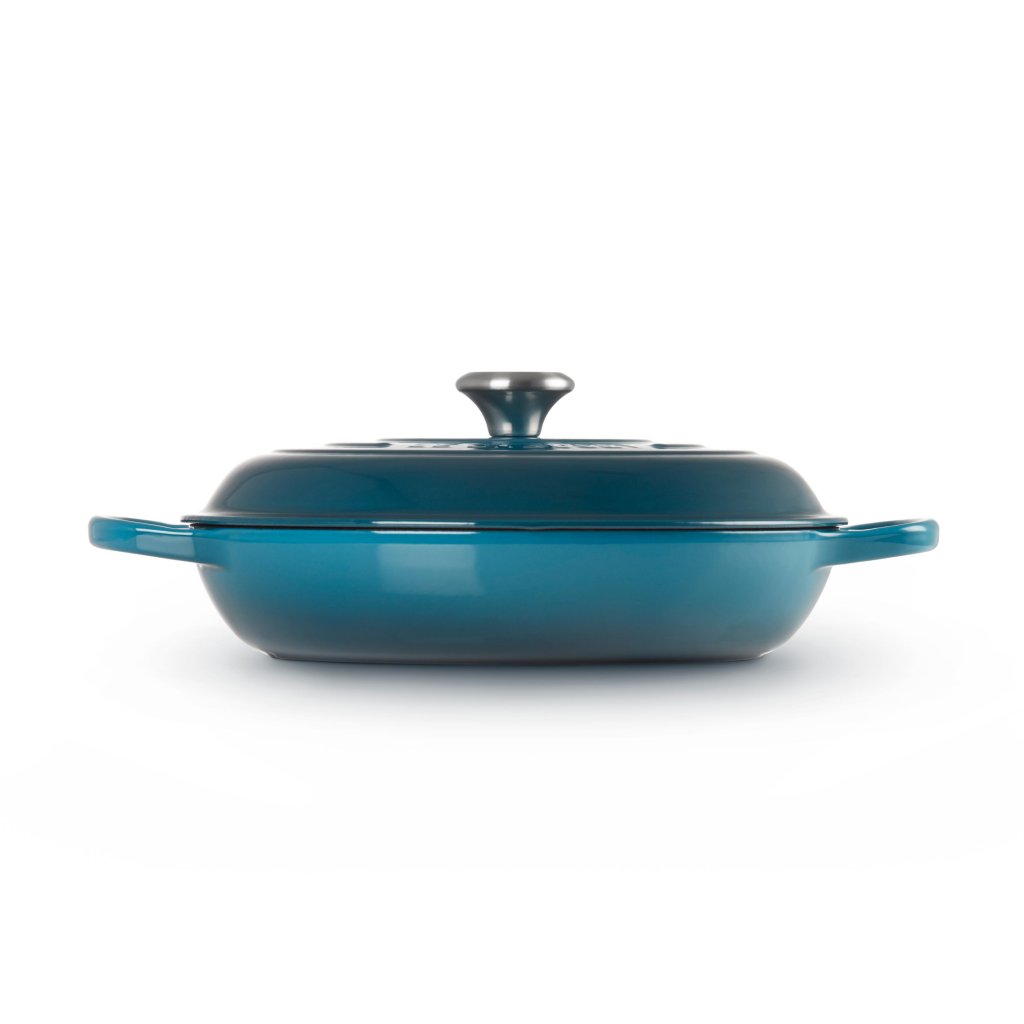 - A lábas Le Creuset jelű, DEEP TEAL színű lapos öntöttvas Franciaországban készül, és a márka egyik legendás darabja, ideális pároláshoz, sütéshez, pirításhoz és pirításhoz 4-6 fő részére.
