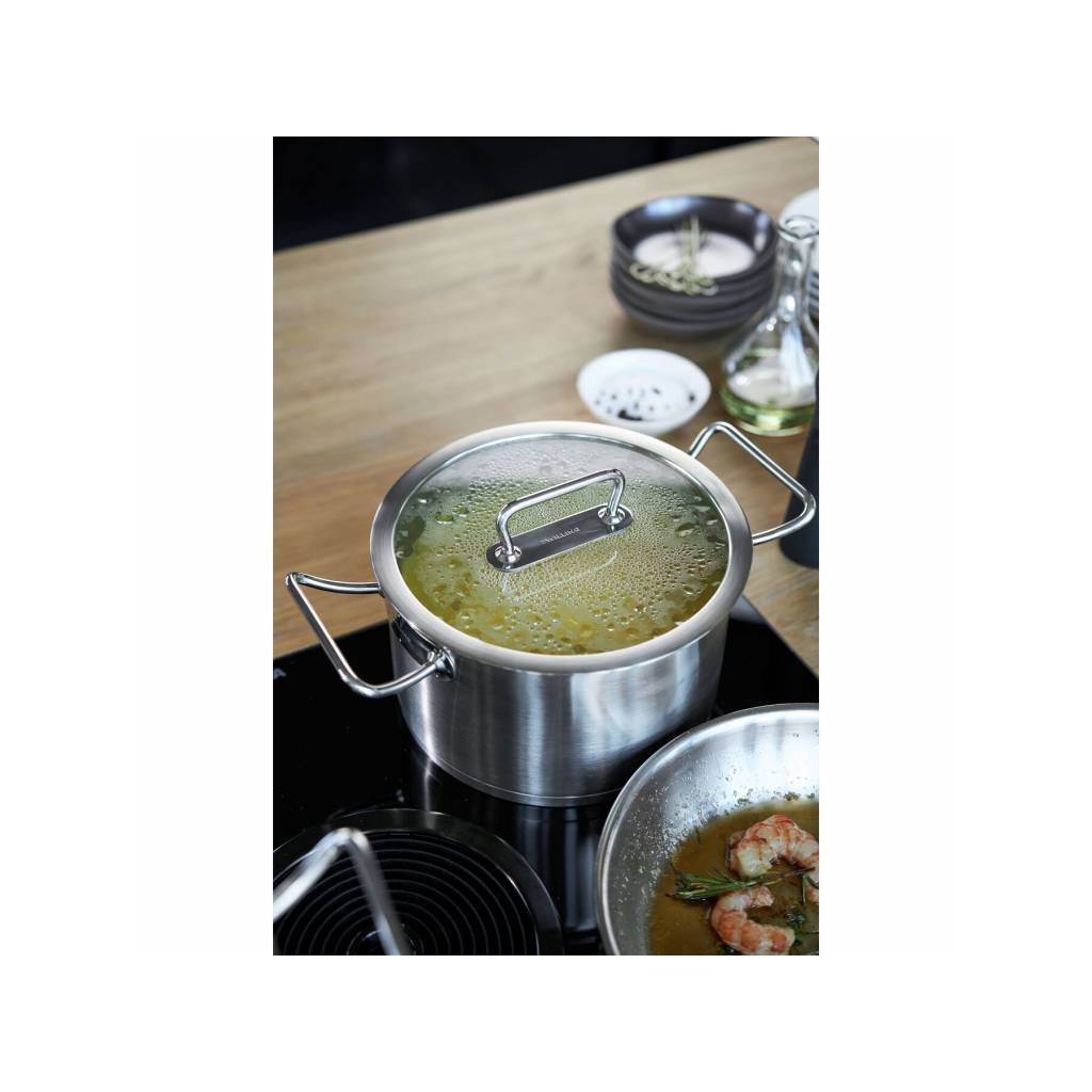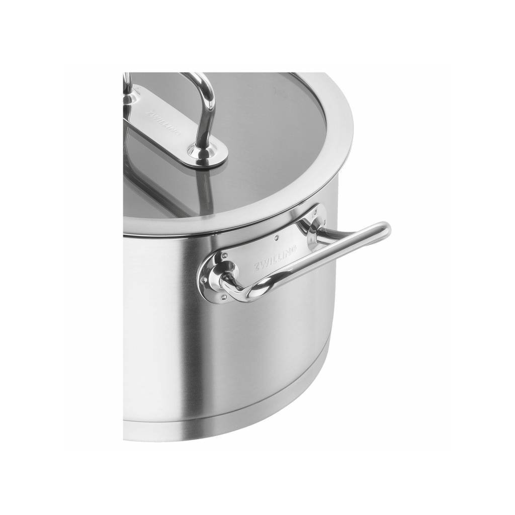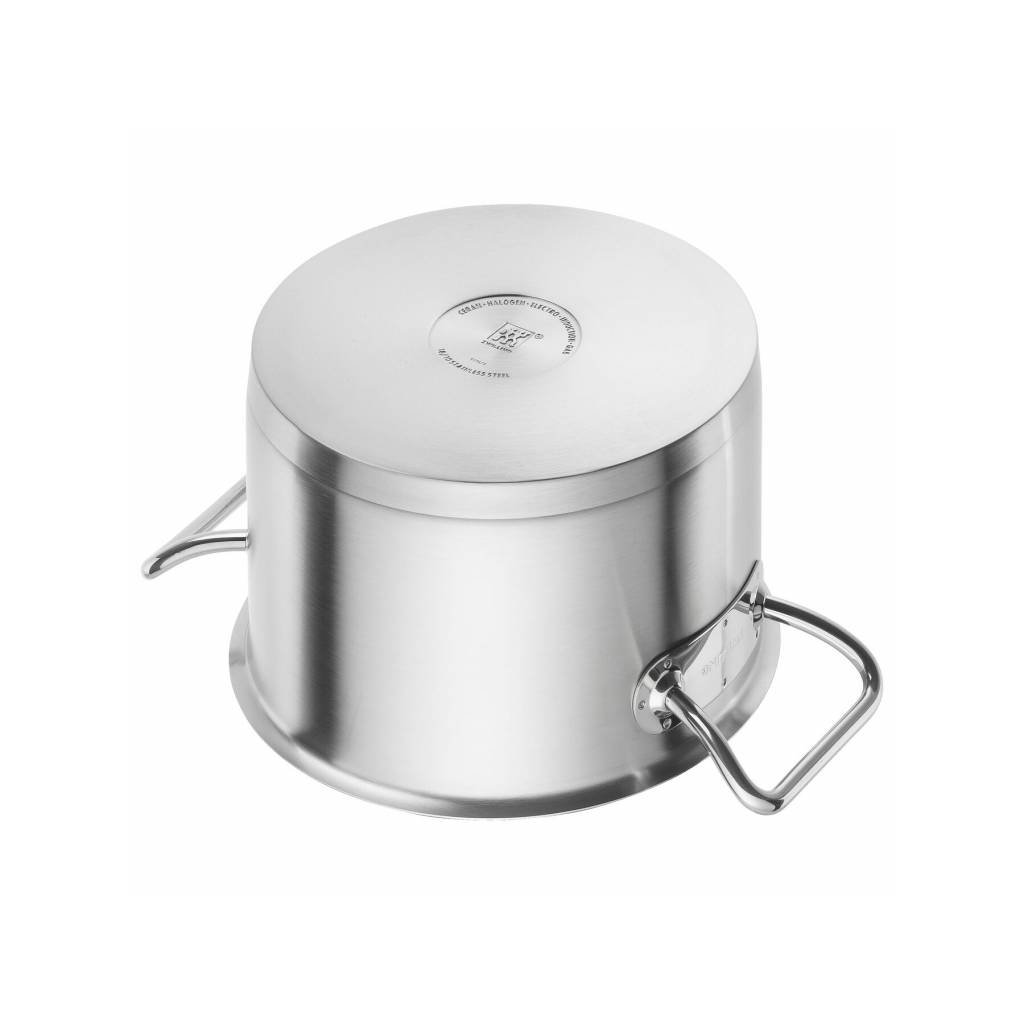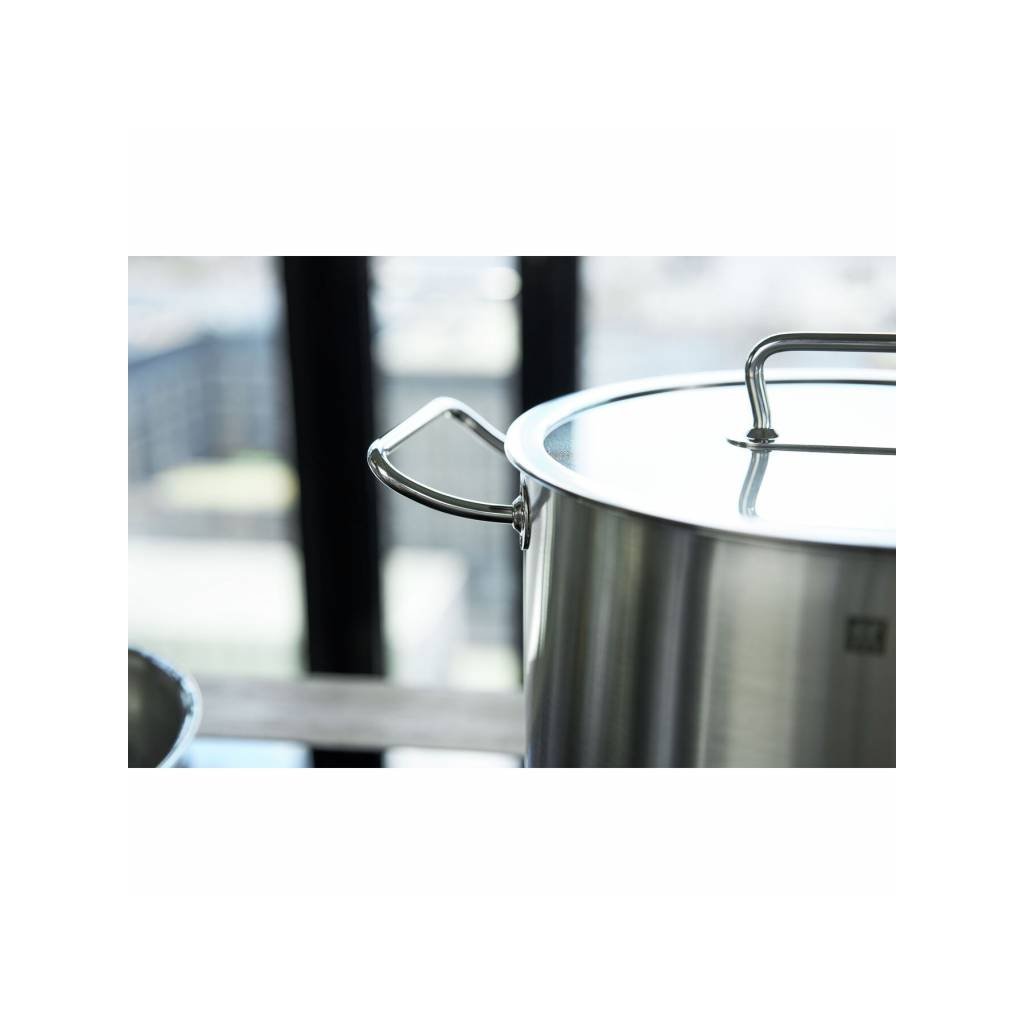 A Zwilling Pro rozsdamentes acélból készült, 20 cm átmérőjű, nagy fogantyúkkal ellátott, gyönyörű matt kivitelű, 20 cm átmérőjű magas edény fedővel otthoni és professzionális használatra egyaránt alkalmas. A titán-oxiddal edzett szendvicspad ideális az energiatakarékos főzéshez. Alkalmas minden hőforráshoz, beleértve az indukciót is, és sütőben való sütéshez.