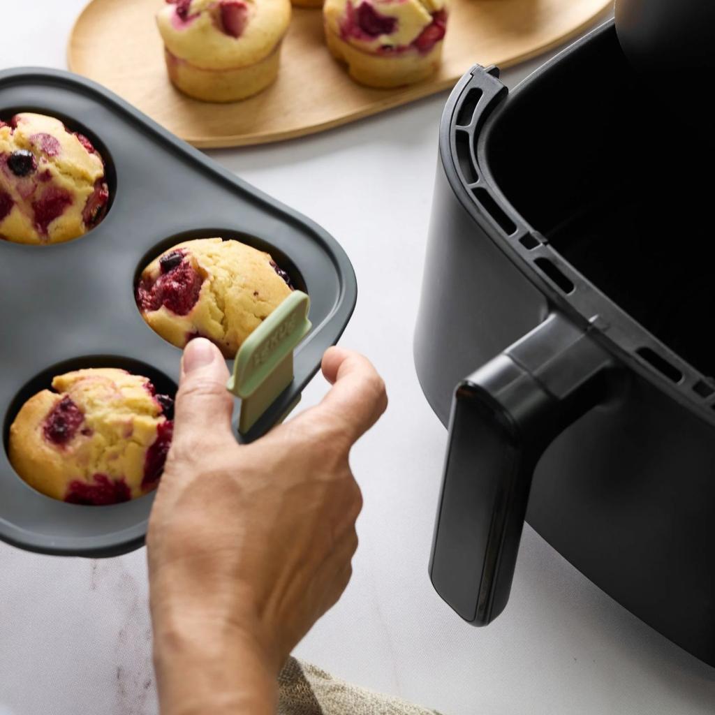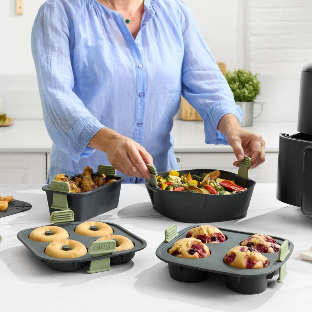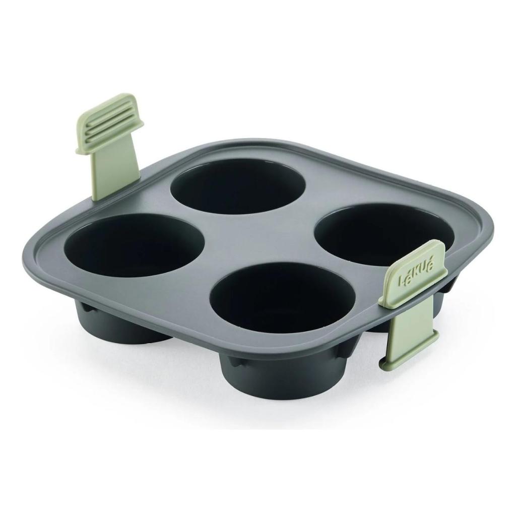 - A Muffin forma Lékué ideális négy puha muffin gyors és egyszerű elkészítéséhez közvetlenül a forrólevegős fritőzben.
