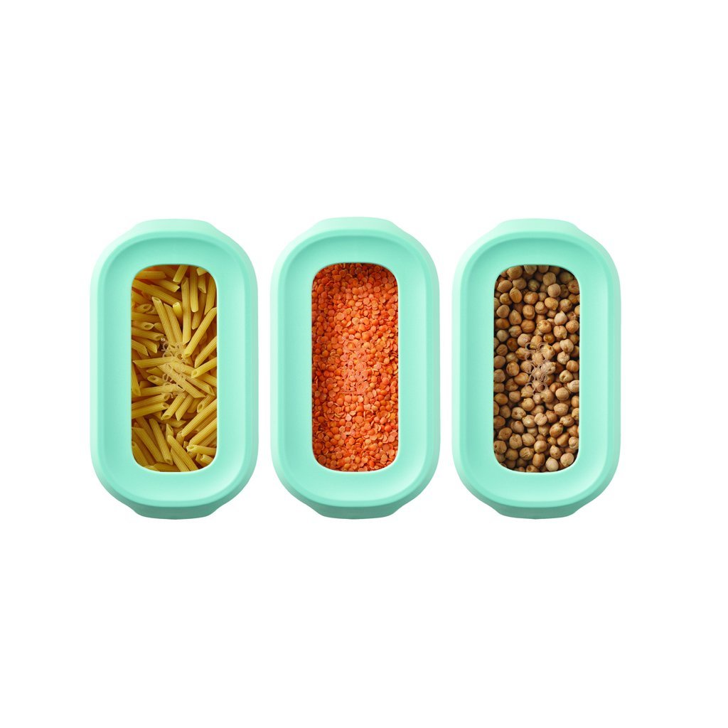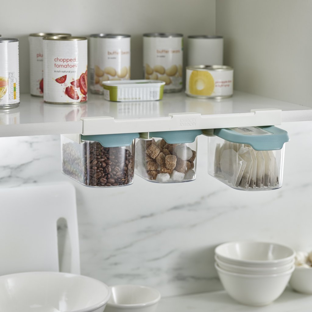 JOSEPH JOSEPH CupboardStore 81111, 3x900ml a konyhai polc alá helyezhető üvegek, 3 x 900 ml-es készlet + 3M szalaggal stabilizált polc alatti tartó, száraz élelmiszerek tárolására alkalmas, légmentesen záródó üvegek.