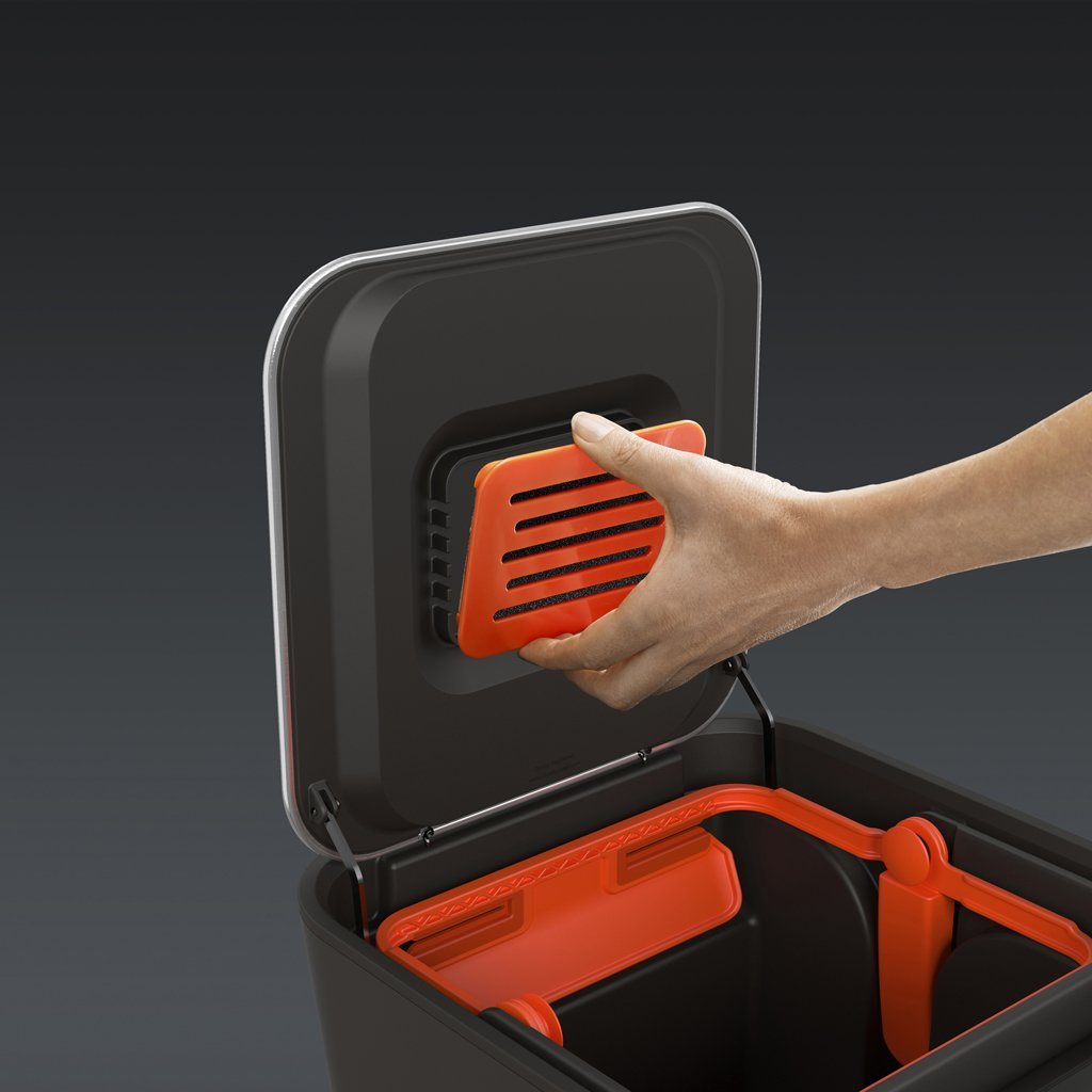 Kiváló minőségű rozsdamentes acélból készült, amely ellenáll az ujjlenyomatoknak. A környezet védelme érdekében a kosár egyedülálló szemétpréselő rendszert alkalmaz. 3x nagyobb helytakarékosságot és ritkább zsákcserét garantál. A kosár szélei megkönnyítik a zsákok elhelyezését, és szellőzőnyílásokkal rendelkezik. Nagy előnye a szagokat semlegesítő, könnyen cserélhető szénszűrő. A gyártó azt javasolja, hogy 3 havonta cserélje ki.