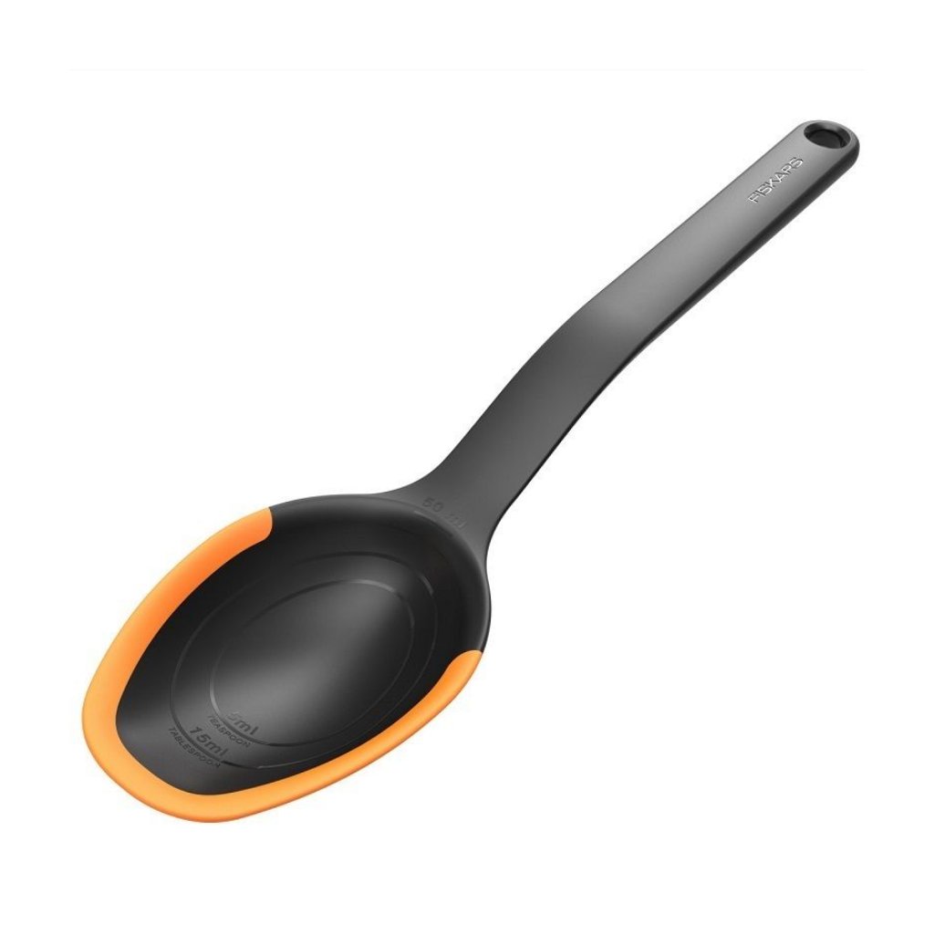 Kiváló minőségű műanyagból készült konyhai kanál, rugalmas szilikonszélekkel, amelyek könnyen letörölhetők bármilyen edényről. A rugalmas szilikonszegély tapad a serpenyőkhöz és edényekhez, és a felület megkarcolása nélkül letörli az ételmaradékot. A fogantyú végén egy praktikus lyuk található a felakasztáshoz. Alkalmas jobb- és balkezes felhasználók számára. A kanál használható főzéshez és tálaláshoz. Mérőműszerként is használható, mivel a munkarészben beépített mérőskálatalálható. A skálának köszönhetően 1 teáskanál, 1 evőkanál és 0,5 dl mérhető.