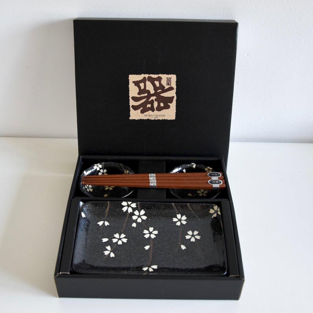 Sushi szett evőpálcikákkal BLACK WITH WHITE PETALS, 6 db, MIJ