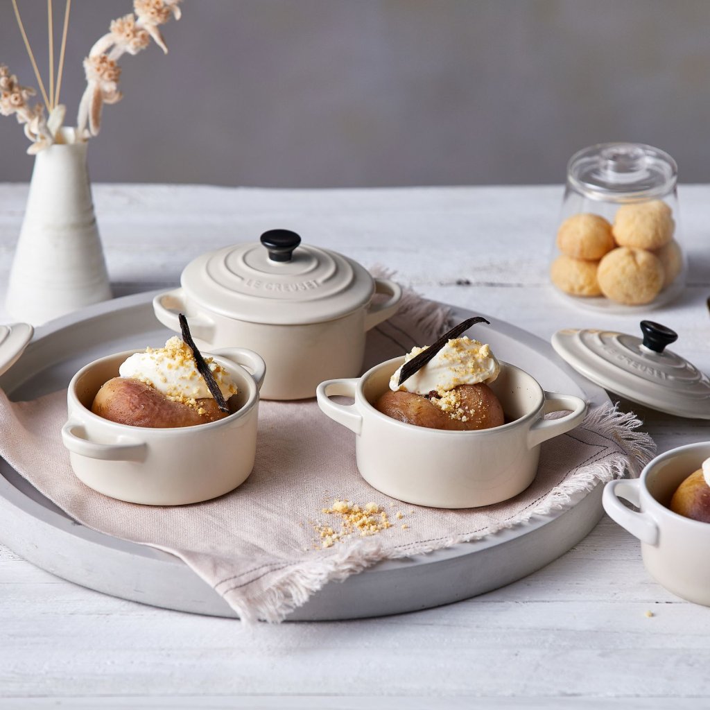 - A MERINGUE árnyalatú, kis kerámia fazék Le Creuset ideális adagok, szószok vagy kisebb ételek tálalásához.