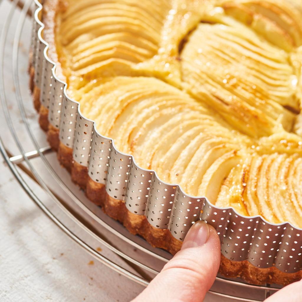 - A 3 cm magas, recés, perforált rozsdamentes acél perem de Buyer elegáns sütemények, piték és tortalapok készítéséhez készült.