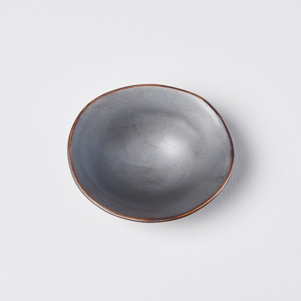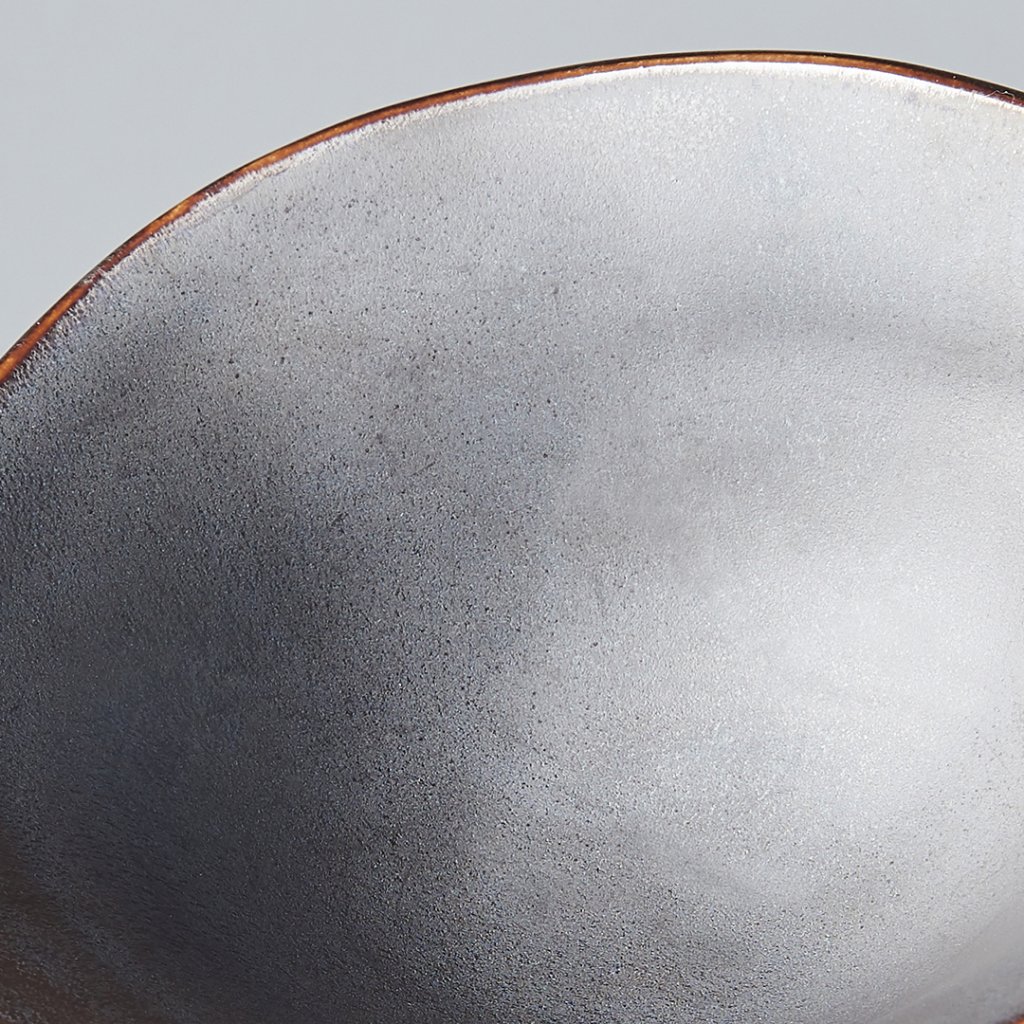 A tál nagyon szabálytalan kör alakú és gyönyörű fémes megjelenésű, szabálytalan peremmel.