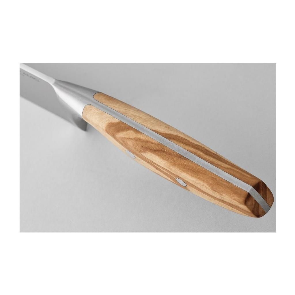 - A formázott kovácsolt penge egyedi színű olajfa markolattal kombinálva, amely minden kést eredetivé tesz