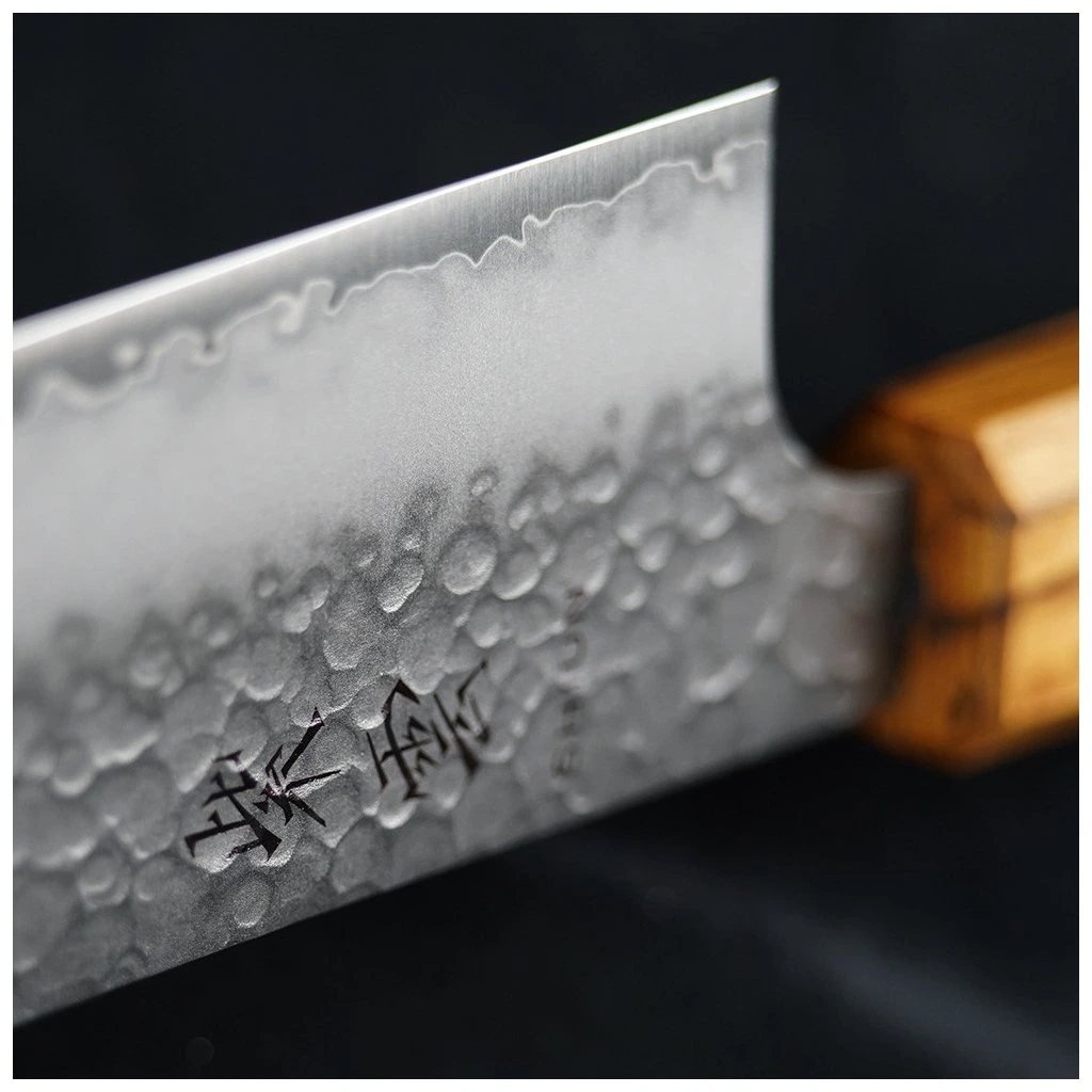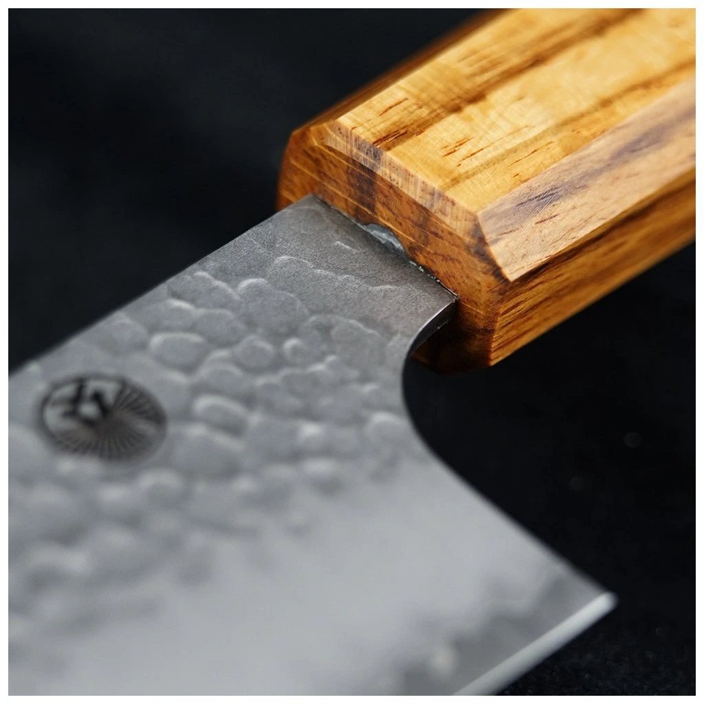 - a japán tölgyfából készült ergonomikus nyolcszög alakú nyél kényelmes és biztonságos fogást biztosít, növelve a szeletelés közbeni kontrollt