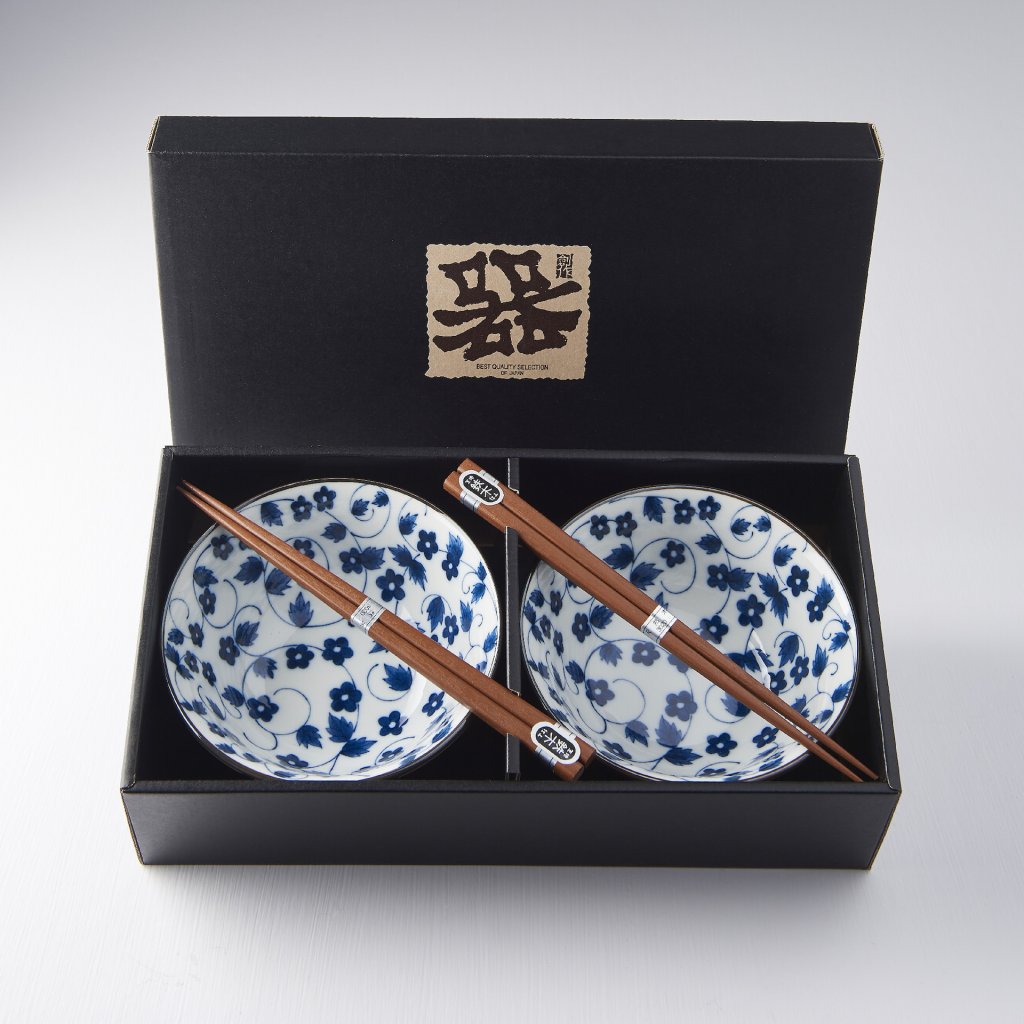 A készlet 2 pár fa evőpálcikát és 2 tálat tartalmaz, fehér színben, kék színű, kézzel festett virágokkal. Ez a készlet elegáns fekete díszdobozbankerül, ezért alkalmas ajándéknak barátoknak vagy üzleti partnereknek.