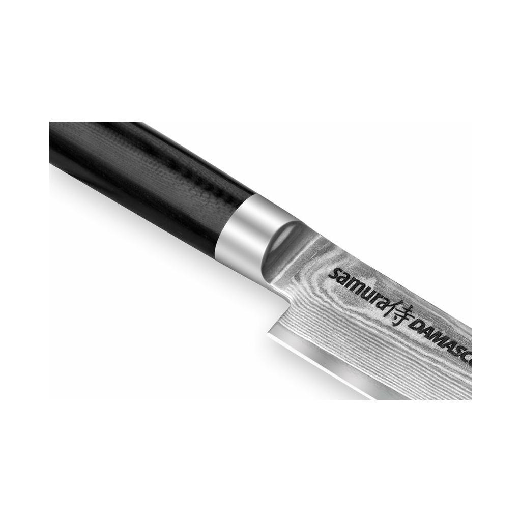 A Samura DAMASCUS kések markolata ellenáll a kopásnak, a nedvességnek és nagyon erős. A Samura Damascus termékcsalád a japán minimalizmus csúcsa. A penge japán és svéd rozsdamentes acélból készült. Az AUS-8 rozsdamentes acél sokkal tartósabb és jobban tartja az élességet, mint a hagyományos konyhai kés. Szintén viszonylag könnyen élezhető magas élességre.