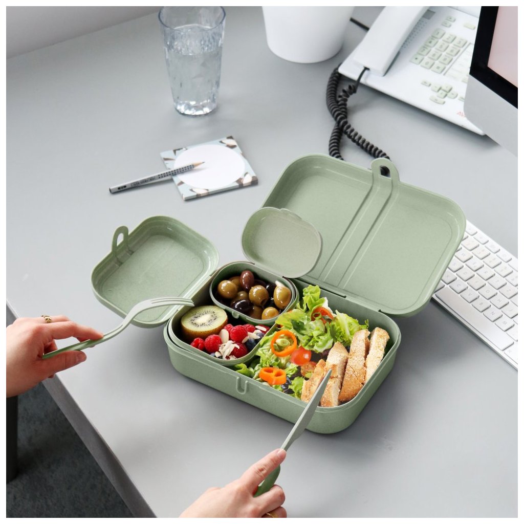 Uzsonnás doboz készlet PASCAL READY, utazó evőeszköz készlettel, organikus zöld, Koziol