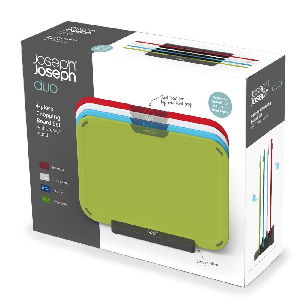 - A Joseph Joseph DUO ICON vágódeszka-készlet állvánnyal praktikus megoldást kínál a különböző élelmiszerek higiénikus elkülönítésére a mindennapi otthoni konyhában.