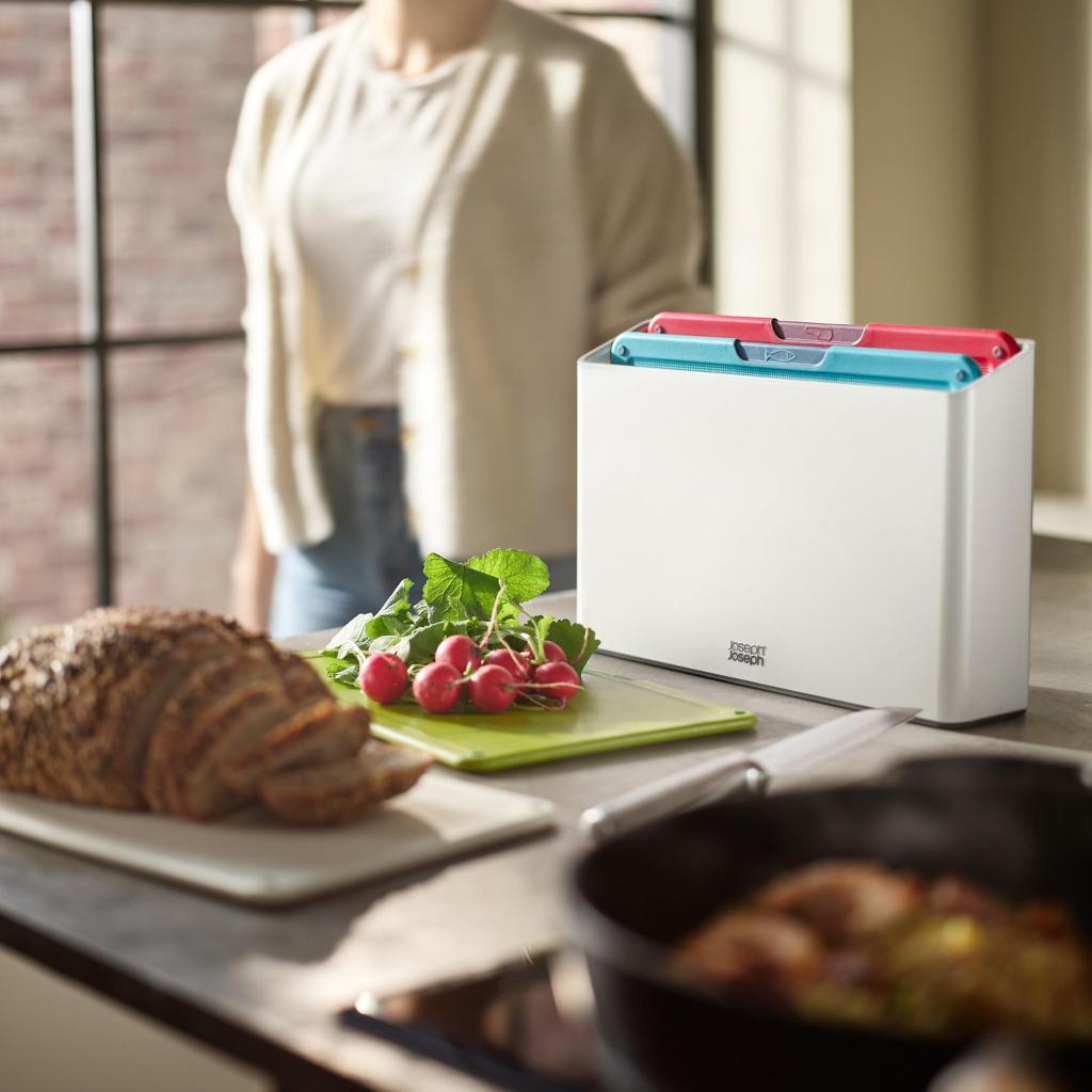 - A kompakt tárolóállvány áttekinthetően rendszerezi az összes vágódeszkát, miközben helyet takarít meg a konyhai munkafelületen.