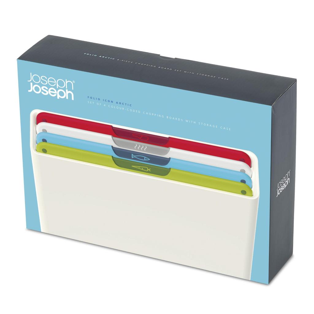- A Joseph Joseph FOLIO ICON vágódeszka készlet 4 praktikus vágódeszkát tartalmaz, amelyek egy kompakt állványon helyezkednek el, és segítenek rendben tartani a munkafelületet az ételek mindennapi elkészítése során.