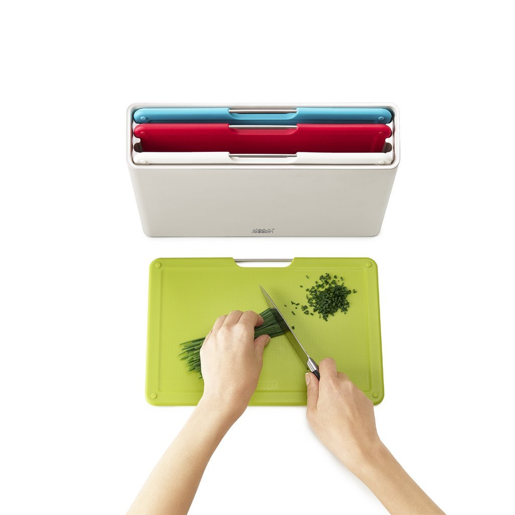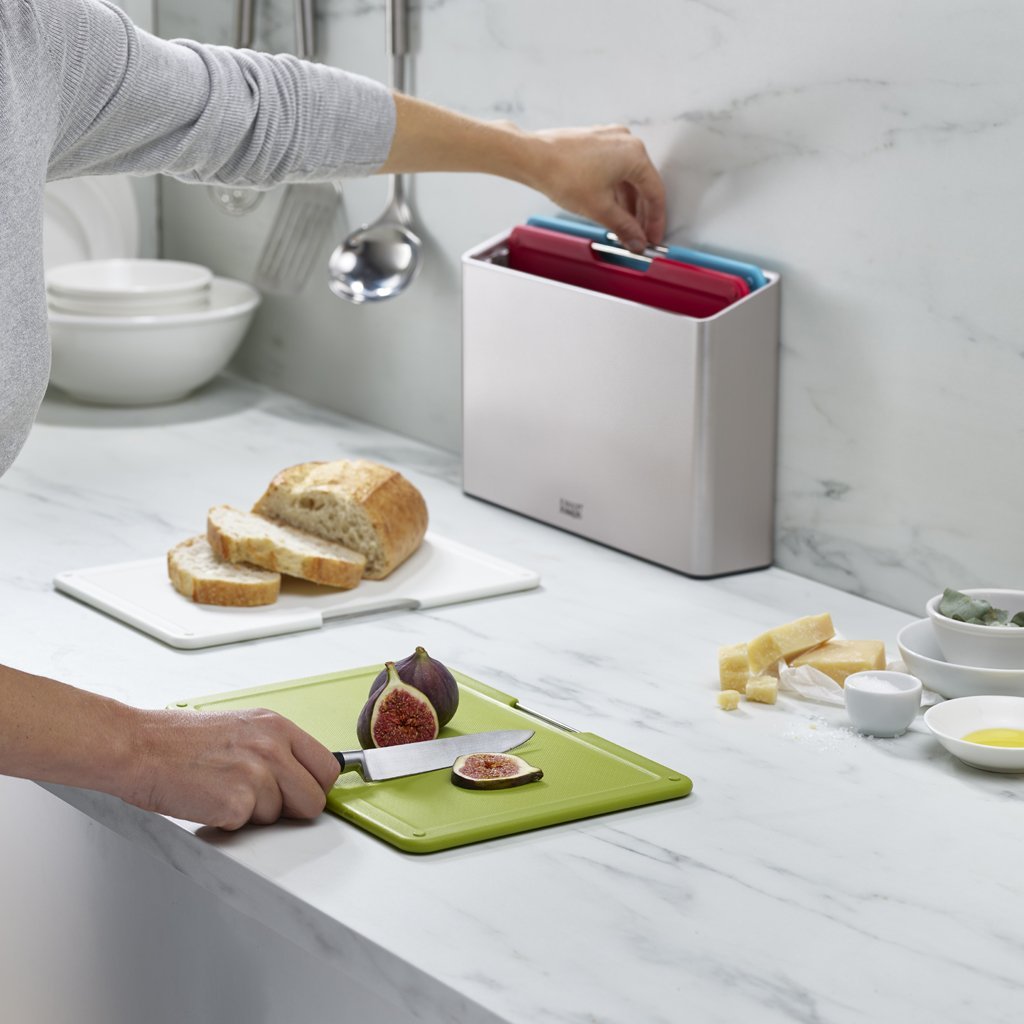 A műanyag vágódeszkák erősségei közé tartozik a könnyű karbantartás, a higiénia és mindenekelőtt az, hogy érzékenyek a késeinkre. A Joseph Joseph márka tervezőinek célja ezúttal az volt, hogy a munkalapon kézre álló vágódeszkákat biztosítsanak, olyan egyedi vágódeszkákat készítsenek, amelyek 100%-ban betöltik a célt, és elegáns tárolásukat is megoldják. A Folio vágódeszka állvány egy készlet a leggyakoribb konyhai munkákhoz.