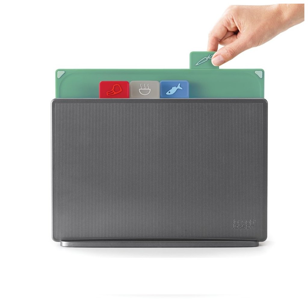 A műanyag vágódeszkák erősségei közé tartozik a könnyű karbantartás, a higiénia és mindenekelőtt az, hogy érzékenyek a késeinkre. A Joseph Joseph márka tervezőinek célja ezúttal az volt, hogy a munkalapon kézre álló vágódeszkákat biztosítsanak, olyan egyedi vágódeszkákat készítsenek, amelyek 100%-ban betöltik a célt, és elegáns tárolásukat is megoldják. Az Index vágódeszka állvány egy készlet a leggyakoribb konyhai munkákhoz.